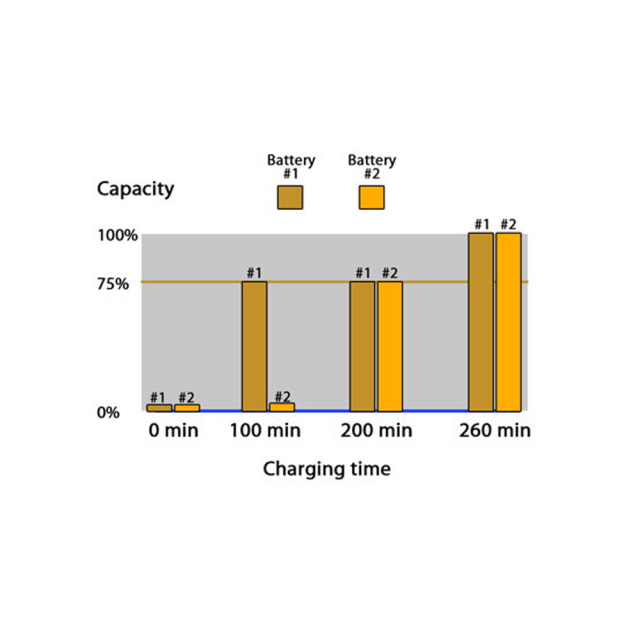 A 4 szintű LED-es töltésjelzők minden csatornához tartoznak, amelyek töltés közben százalékosan jelzik a valós idejű kapacitást.