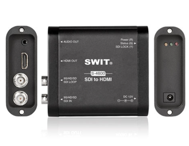 A SWIT S-4600 egy kompakt 3G/HD/SD-SDI-HDMI® átalakító, amely SDI videó jelek HDMI® eszközökön, például televíziókon, LED-képernyőkön és projektorokon történő megjelenítésére szolgál, audio beágyazással és átviteli támogatással.