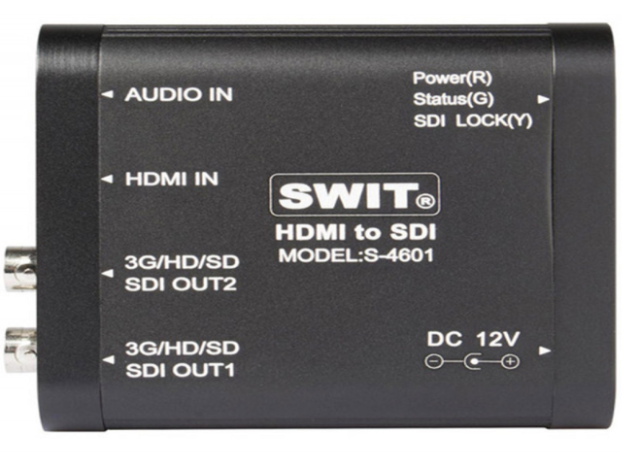 A SWIT S-4601 egy hordozható, nagy teljesítményű HDMI-3G/HD/SD-SDI átalakító, amely egy HDMI bemenettel és két SDI kimenettel rendelkezik. Támogatja a beágyazott HDMI hangot, valamint a 3,5 mm-es bemeneten keresztül a külső analóg hangot is, mindkettő integrálva az SDI kimenetbe. Robusztus fémházban, alul csavarmenettel a biztonságos felszereléshez, ideális megoldás professzionális sugárzáshoz, élő produkciókhoz és AV munkafolyamatokhoz.