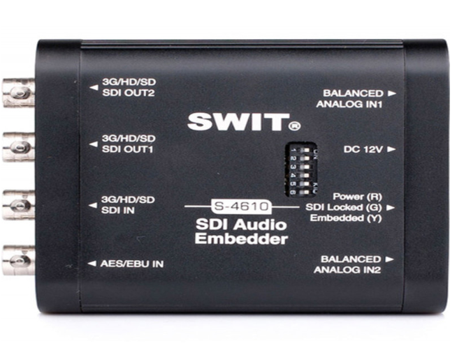 A Swit S-4610 Rugged SDI Audio Embedder egy sokoldalú mini SDI audio beágyazó, amely zökkenőmentesen integrálja az audiót az SDI munkafolyamatába. Támogatja mind a 2-csatornás AES/EBU digitális audiót, mind a kiegyensúlyozott analóg audió bemeneteket, és az audiót az első nyolc SDI pozíció bármelyikébe beágyazza. A 3G/HD/SD-SDI jelekkel kompatibilis, kompakt eszköz két integrált SDI kimenettel, három LED jelzőfénnyel (tápellátás, SDI bemenet észlelése és kimenet állapota) és tartós alumínium vázzal rendelkezik, amely a terepi produkciók igénybevételeinek is megfelel.