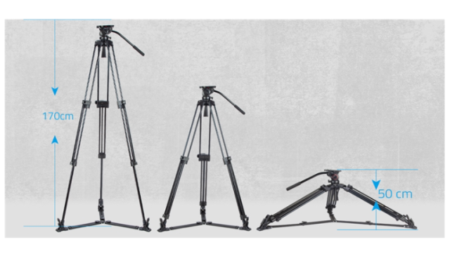 Az állvány háromrészes lábai 50 cm-től 170 cm-ig állíthatók egyetlen csatlakozóval és reteszelő rendszerrel, így sokoldalú magasságszabályozást biztosítanak a különböző felvételi szögekhez. Az integrált folyadékos fej sima panorámázást és döntést biztosít, állítható csillapítással a pontos kameramozgás érdekében. A fej 360°-os panorámázást és -75°-tól +90°-ig döntést biztosít, míg a világító vízmérték pontos beállítást garantál.