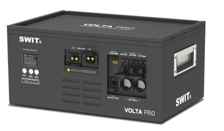 A SWIT VOLTA PRO egy 9 kWh-ás moduláris mobil áramellátó állomás, amelyet professzionális film- és videóprodukciókhoz fejlesztettek ki. Kompakt, Eurobox méretű kialakításában akár 3200 W folyamatos teljesítményt biztosít AC és DC kimenetekkel, így nagy kapacitású, strapabíró és rugalmas áramellátást kínál a igényes forgatási berendezések számára.