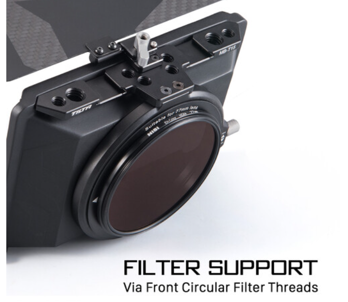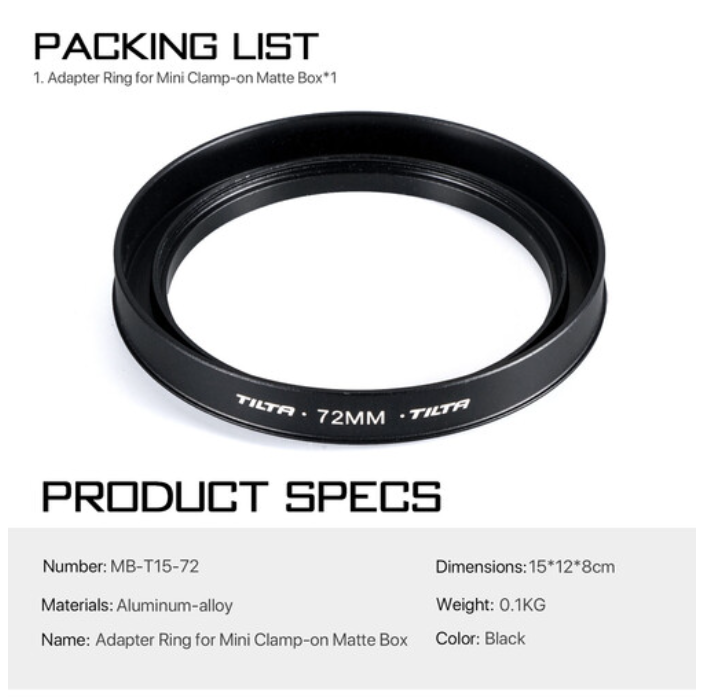 A Tilta MB-T15-72 adaptergyűrű lehetővé teszi a 72 mm-es átmérőjű objektívekhez a Tilta Mini Clamp-On Matte Box biztonságos felszerelését, miközben 72 mm-es szűrőmenettel is rendelkezik a csavarozható szűrők számára.