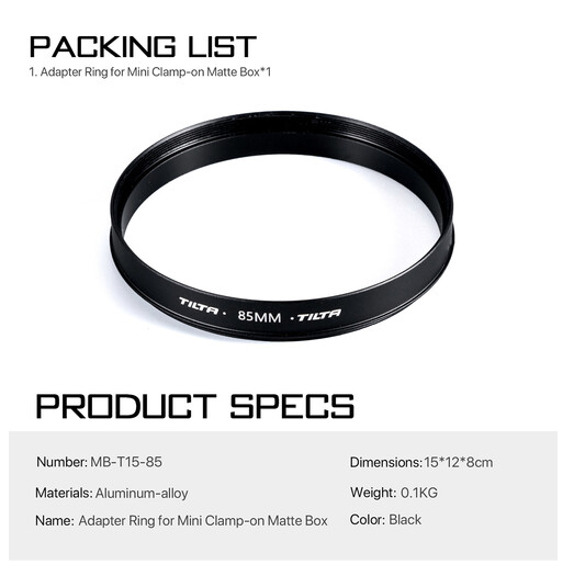 A Tilta MB-T15-85 egy könnyű, fekete alumínium adaptergyűrű, amely bármely 85 mm-es elülső szűrőmenettel rendelkező objektívre csavarozható, lehetővé téve a Tilta Mini Clamp-On Matte Box (MB-T15) biztonságos rögzítését, miközben megőrzi a használható 85 mm-es szűrőmenetet az elülső részen – tökéletes csavarozható ND-k, CPL-ek vagy effekt szűrők egymásra helyezéséhez, mielőtt a matt dobozt kompakt mozi- vagy tükör nélküli objektívekre szerelné.