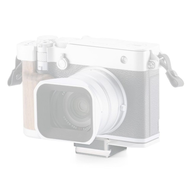 Ez az ARCA gyorsrögzítő lemez közvetlenül a Tilta vintage ketrecekhez készült fa markolatú szerelőalapjának alsó oldalára rögzíthető, és Fujifilm GFX100RF, X100VI és Leica Q3 fényképezőgépekhez használható .