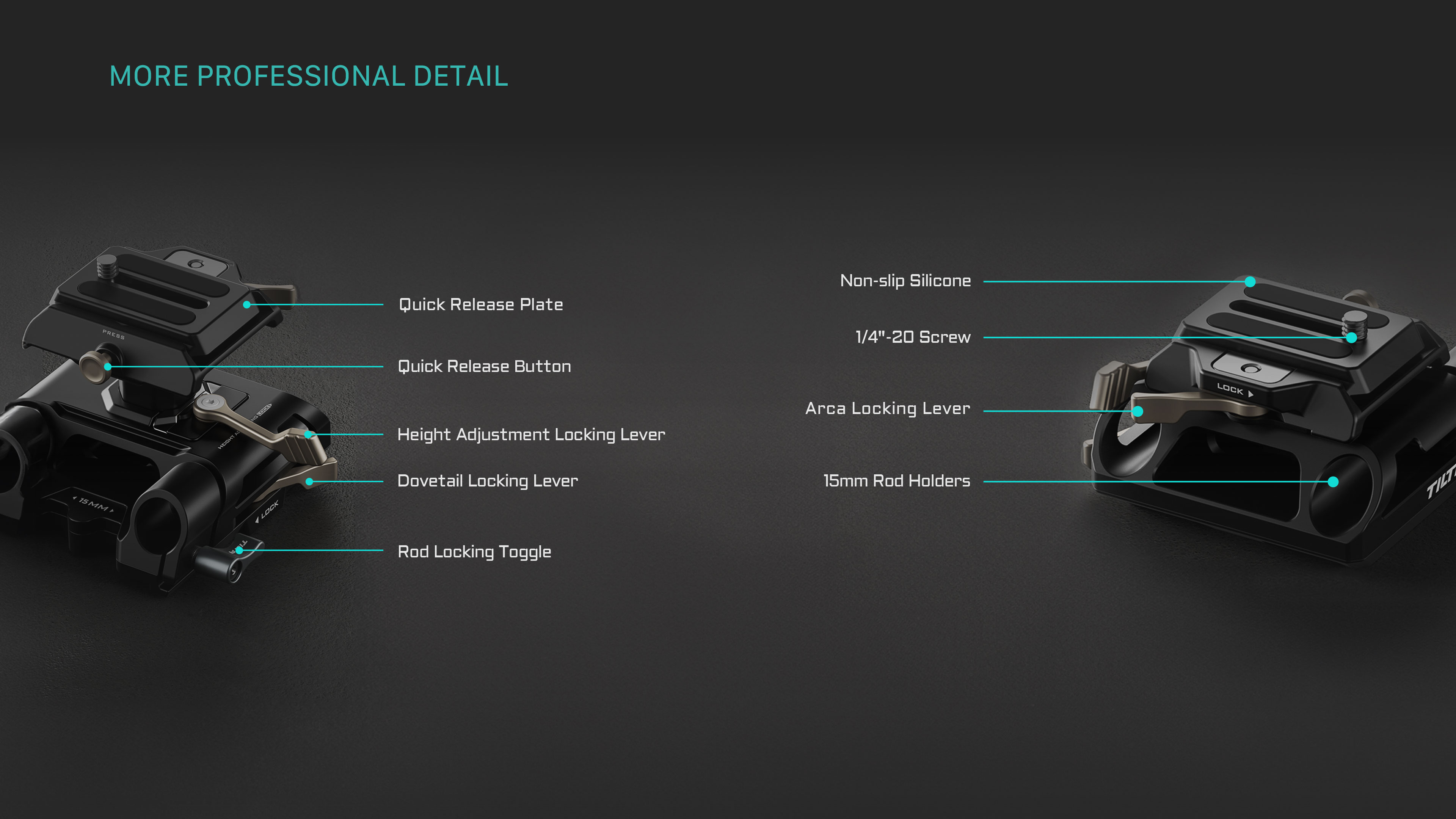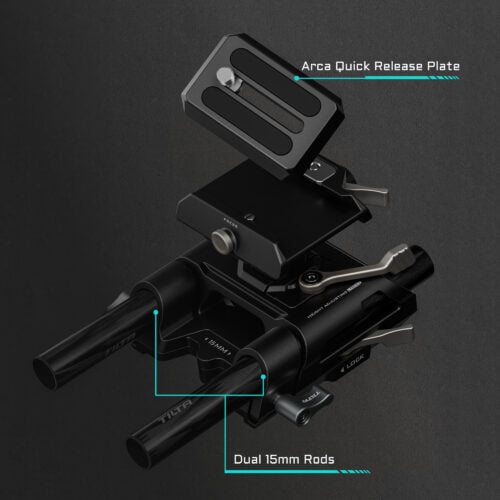 Az alaplemez alja kompatibilis a Tilta szabványos fecskefarokkal, és 1/4″-20-as menettel is rendelkezik az állványokra és más tartórendszerekre való rögzítéshez.
