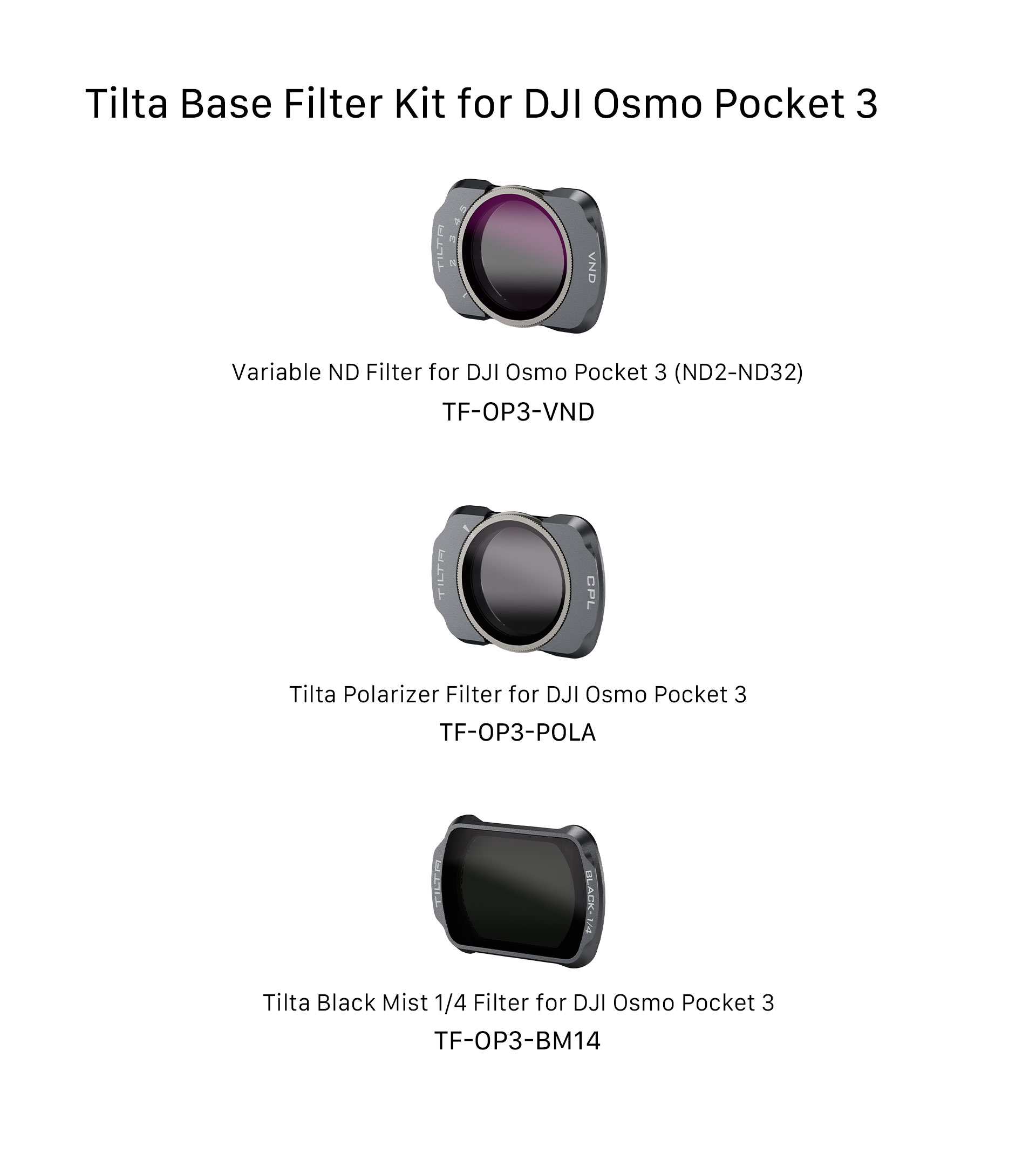 Ez a készlet a következőket tartalmazza: körkörös polarizátor szűrő, 1x Fekete ködszűrő (1/4), 1x VND szűrő (ND2-ND32). A szűrők egyedi tervezésűek a Pocket 3 számára, mágneses csatlakozással rendelkeznek a könnyed csatlakoztatáshoz, míg a Quick-Release barázdált kialakítás, amely lehetővé teszi a gyors, csípéssel eltávolítható hozzáférést.