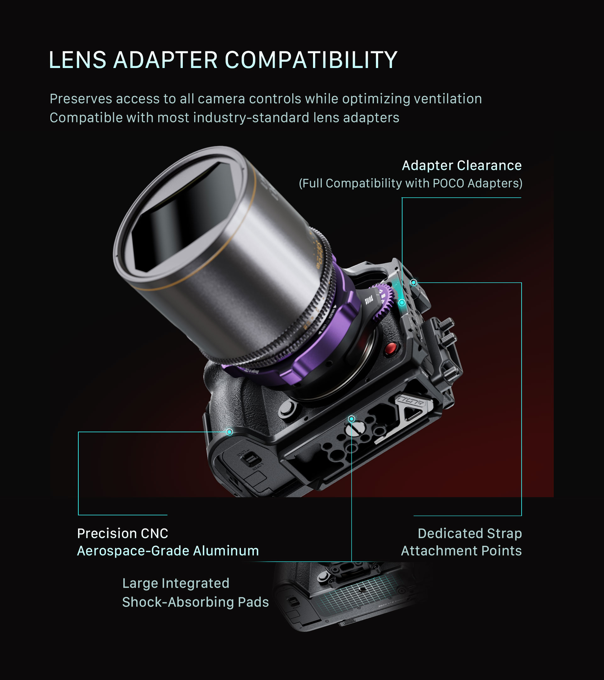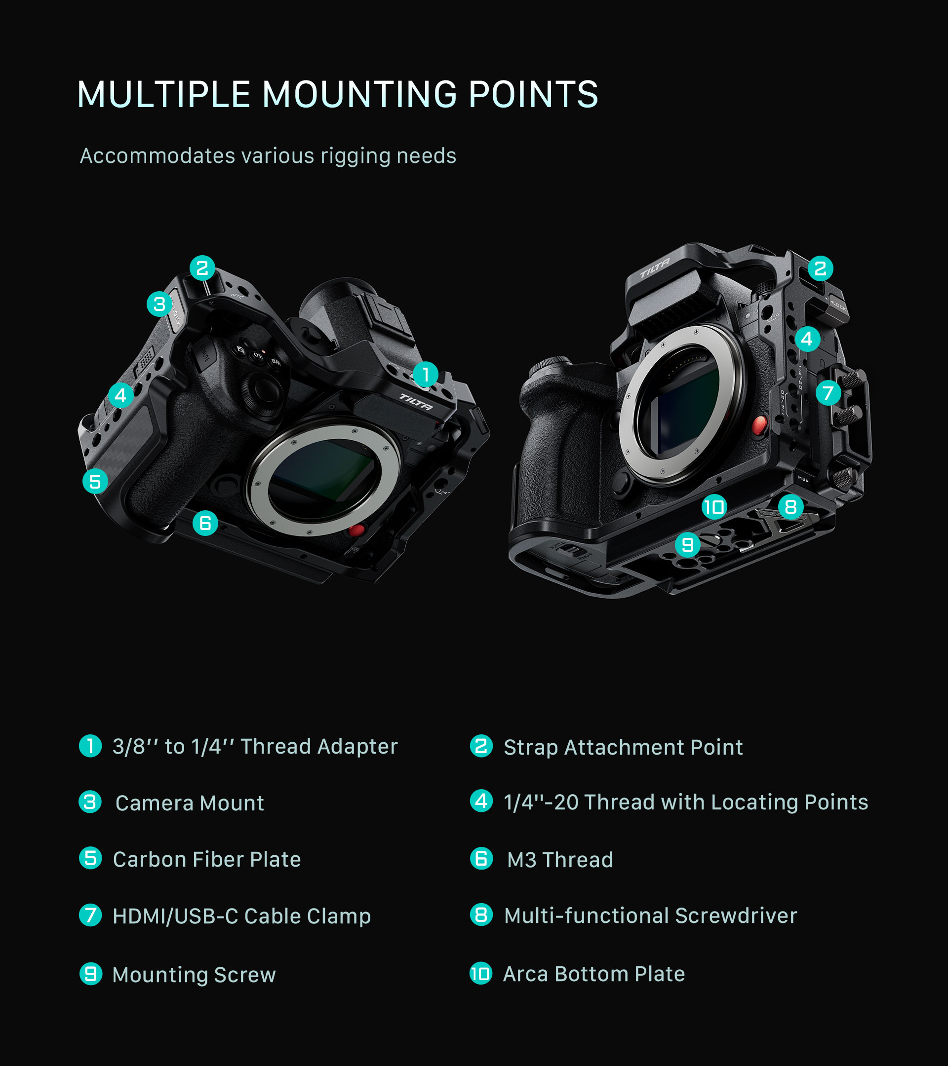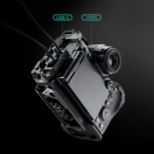 A mellékelt HDMI és USB-C kábelbilincs biztosítja, hogy mindkét kábel biztonságosan rögzüljön a kamera testéhez. A kamera és a keret közötti három érintkezési pont biztosítja a kamera testéhez való szilárd rögzítést és az alapot a további kiegészítők felszereléséhez.