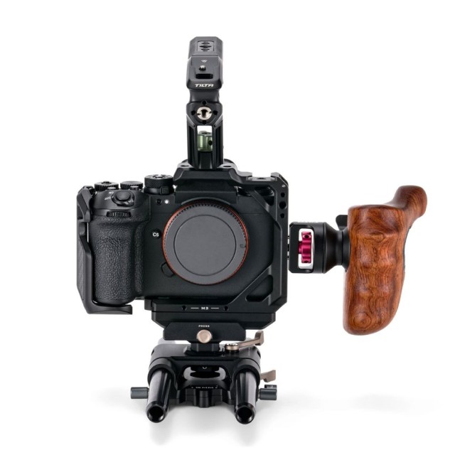 Tartalmaz egy ergonomikus fa fogantyút is, amely 1/4″-20-as pozicionáló csapokkal rögzíthető, így nagyobb kényelmet biztosít a kamera működtetése és tartása közben. A tartó oldalán található kioldógomb segítségével a fogantyú szöge könnyen beállítható az ideális munkapozícióhoz, és felvételváltáskor gyorsan átállítható.
