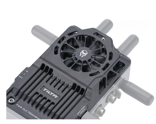 A Tilta TGA-DVT-CS hűtőrendszer (fekete) egy kompakt, aktív félvezető + ventilátoros hűtő, amelyet kifejezetten a DJI Transmission adó vagy vevő túlmelegedésének megakadályozására terveztek hosszú felvételek vagy meleg környezetben történő forgatások során. Négy M4 csavarral rögzíthető, magas/alacsony/kikapcsolt ventilátor sebességet kínál, és közvetlenül a DJI egység USB-C portjáról, külső PD forrásról vagy opcionális NP-F lemezről táplálható.