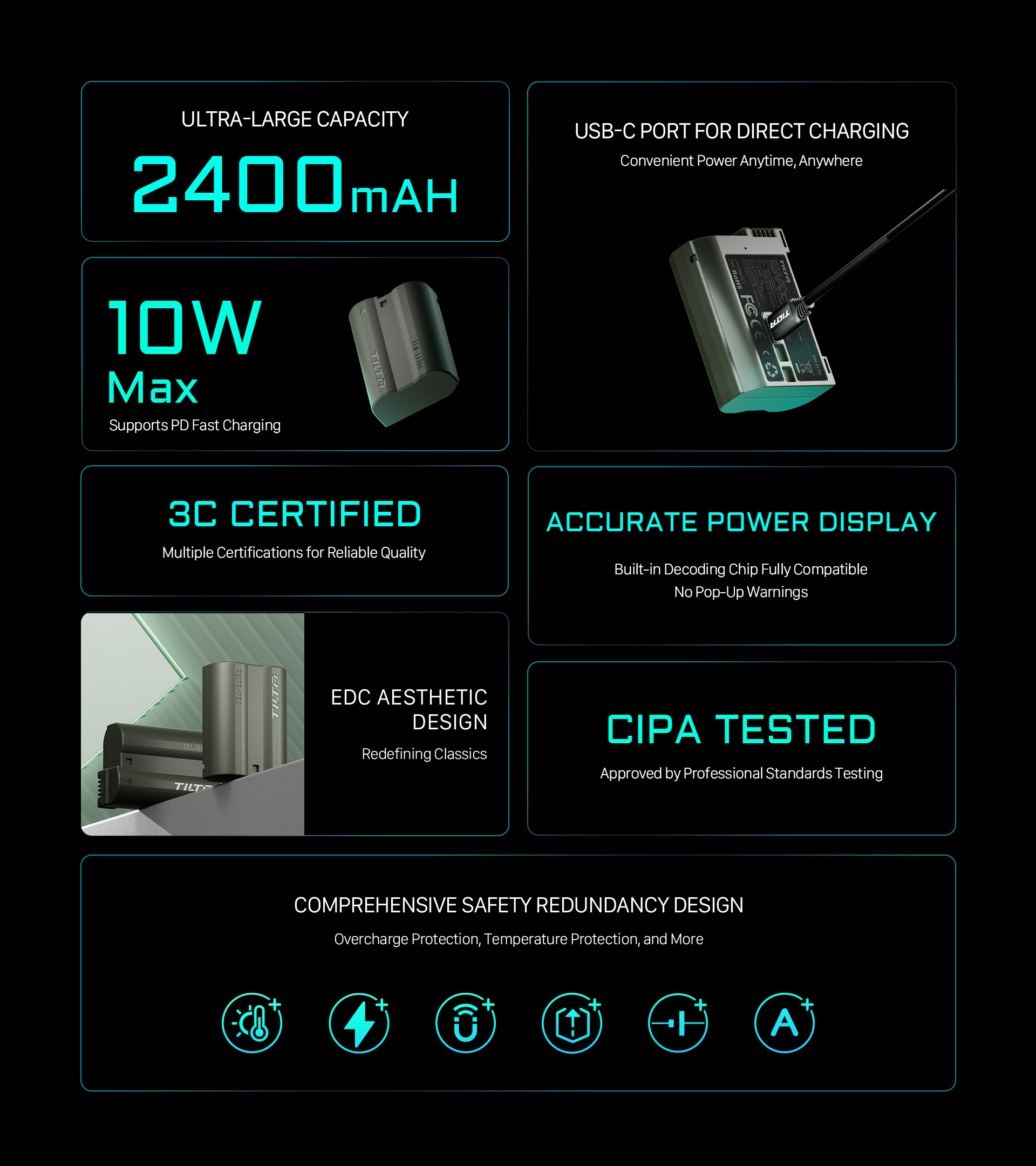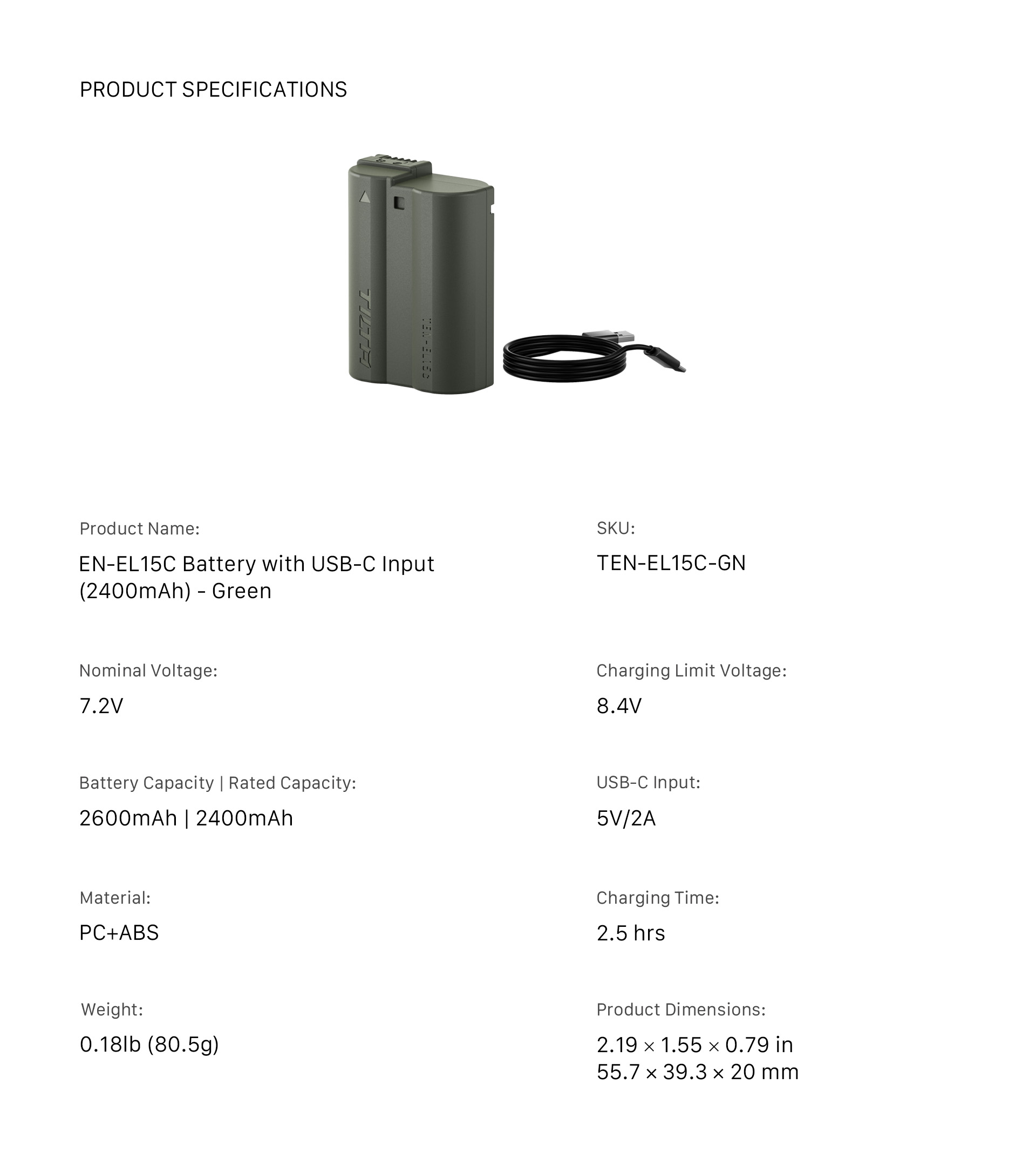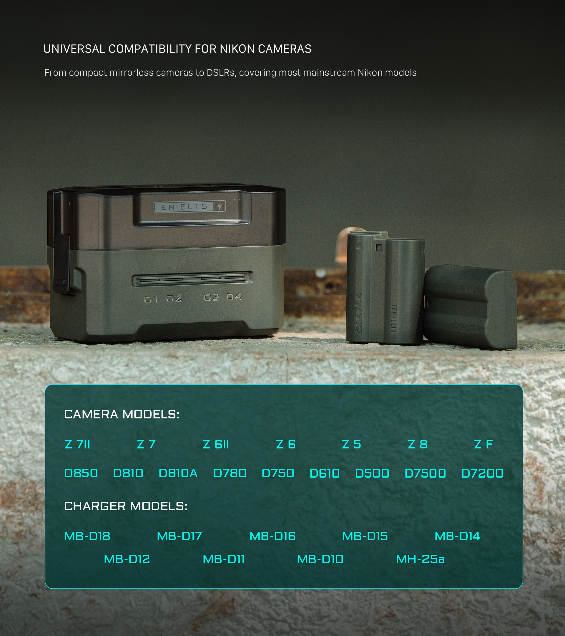 Az EN-EL15C nagy kapacitású akkumulátort úgy tervezték, hogy megbízható, hosszú távú energiát biztosítson fényképezőgépének, így hosszabb ideig készíthet megszakítás nélküli felvételeket. Az innovatív, nagy energiasűrűségű akkumulátorcellával rendelkező akkumulátor hosszabb élettartamot biztosít, így ideális a fényképezéshez és a videózáshoz egyaránt.