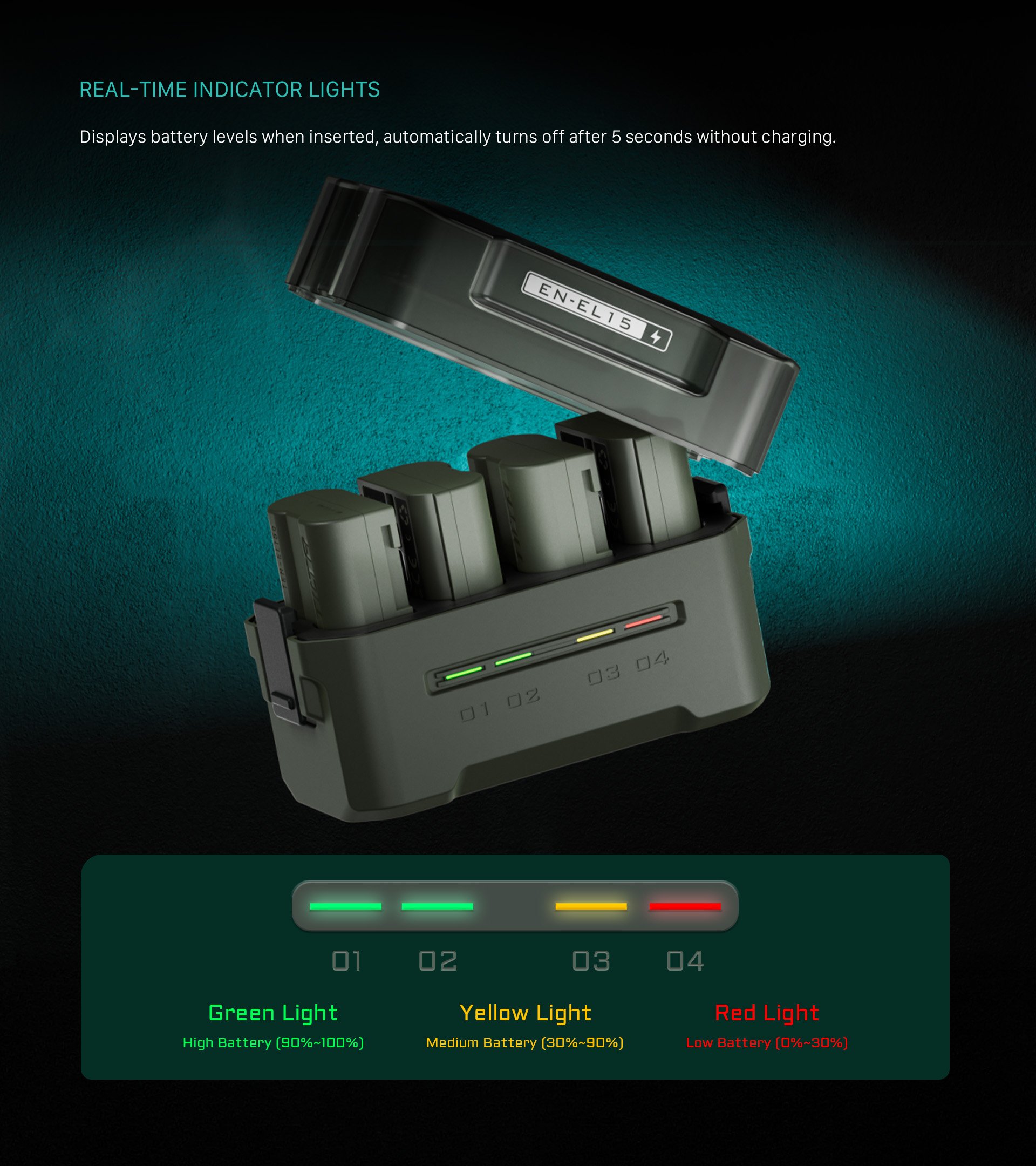Ezt a kompakt töltőállomást a Nikon és harmadik fél EN-EL15C akkumulátorainak támogatására tervezték, és négy rekeszt kínál az egyszerű töltéshez és a kényelmes tároláshoz.