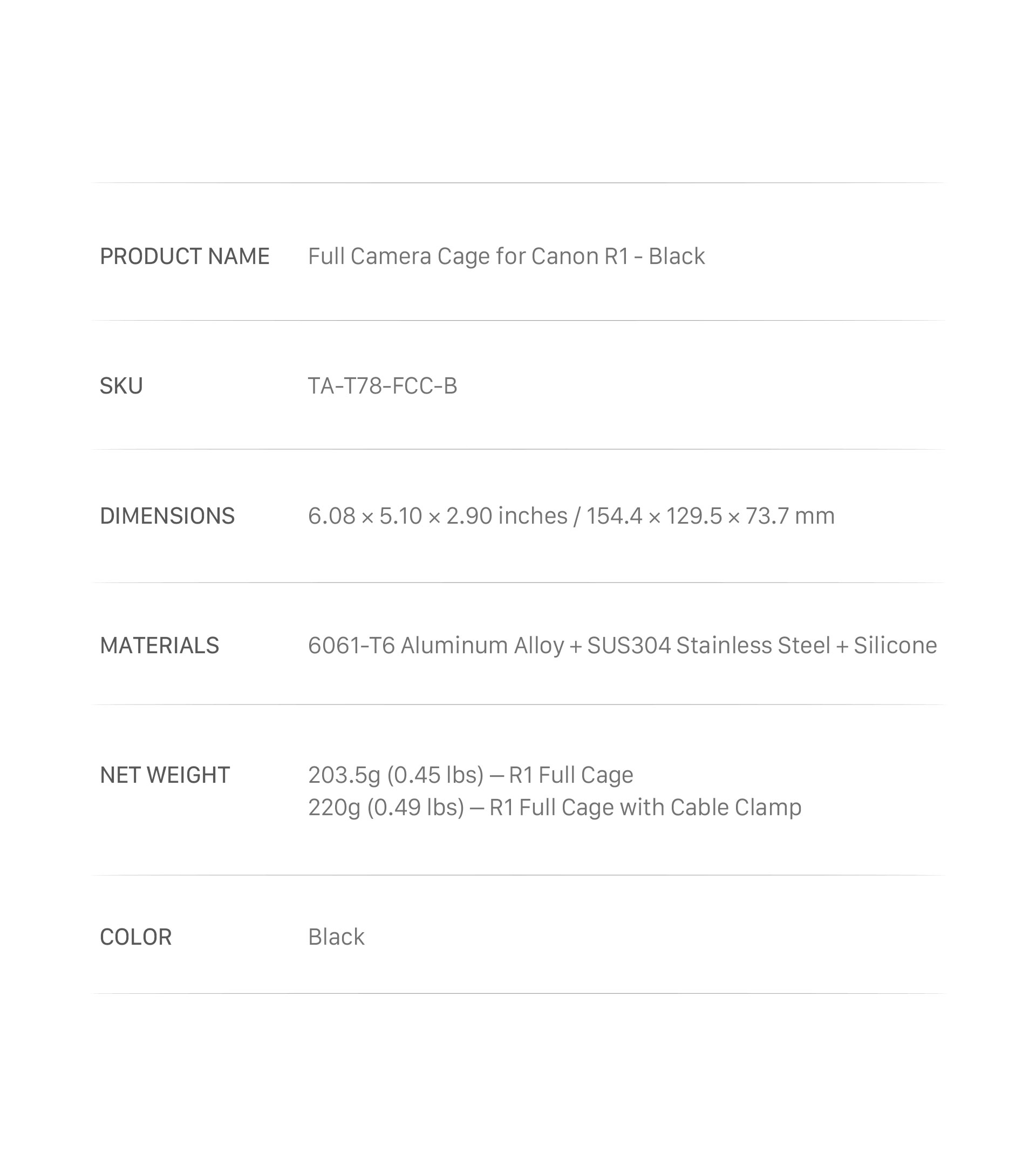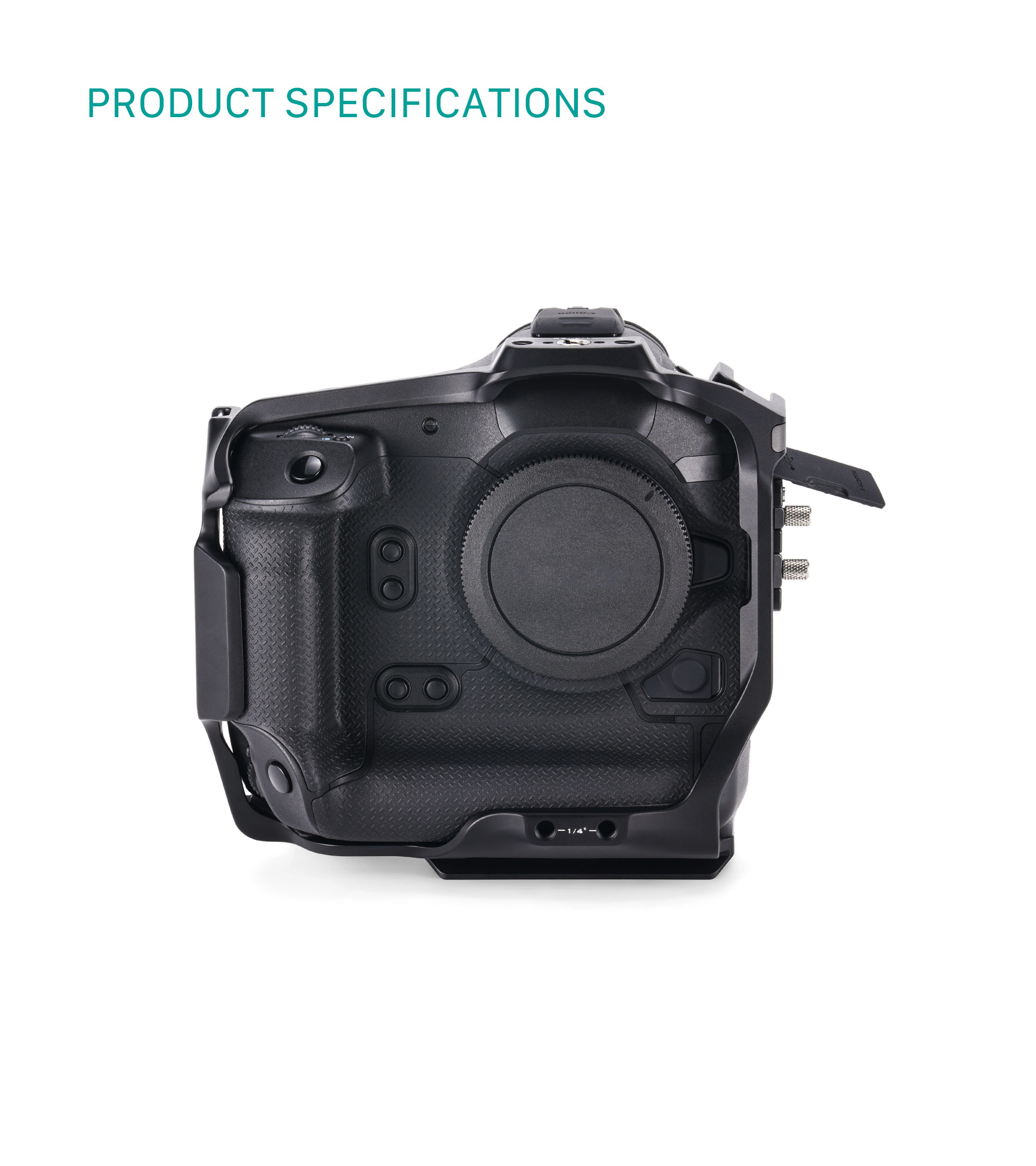 Bemutatjuk a Canon R1 fényképezőgép teljes kameraketrecét. Ez további védelmet nyújt a kameraváznak, miközben bővíti a különböző tartozékok rögzítési lehetőségeit. Ez a teljes kameraketrec hidegcipő-vevővel, csuklópánt rögzítővel, 1/4″-20 menettel és 3/8″-16 1/4″-20 menetes adapterrel rendelkezik.