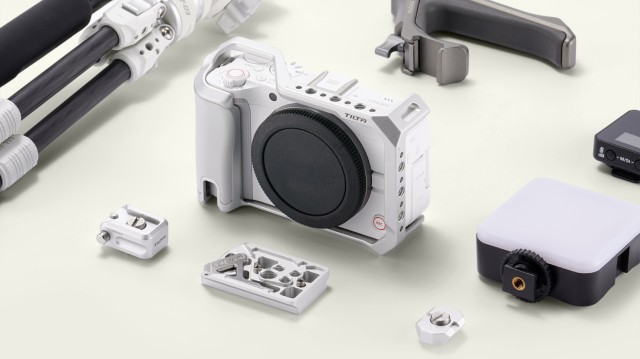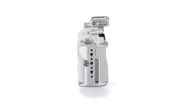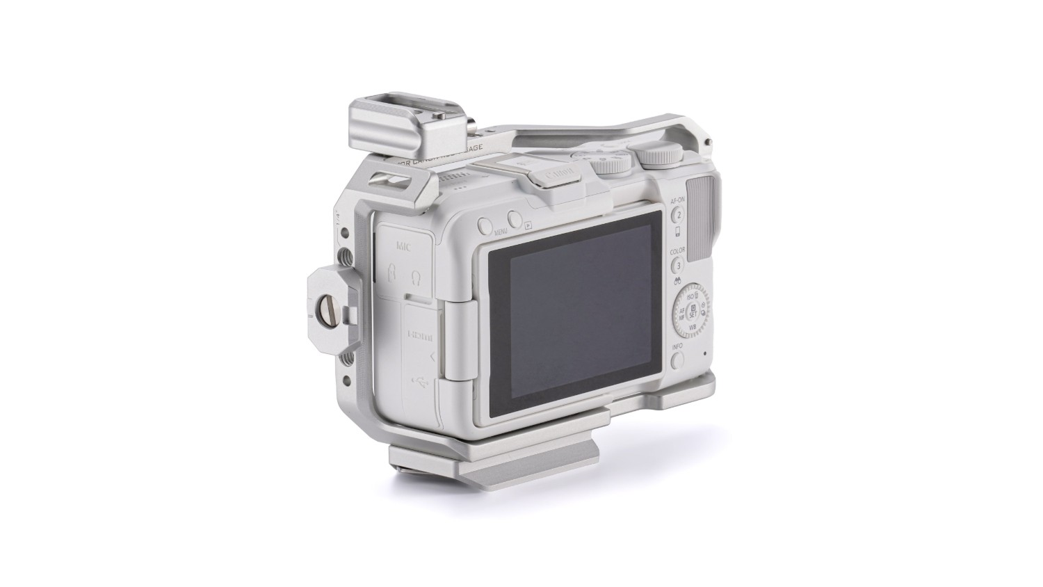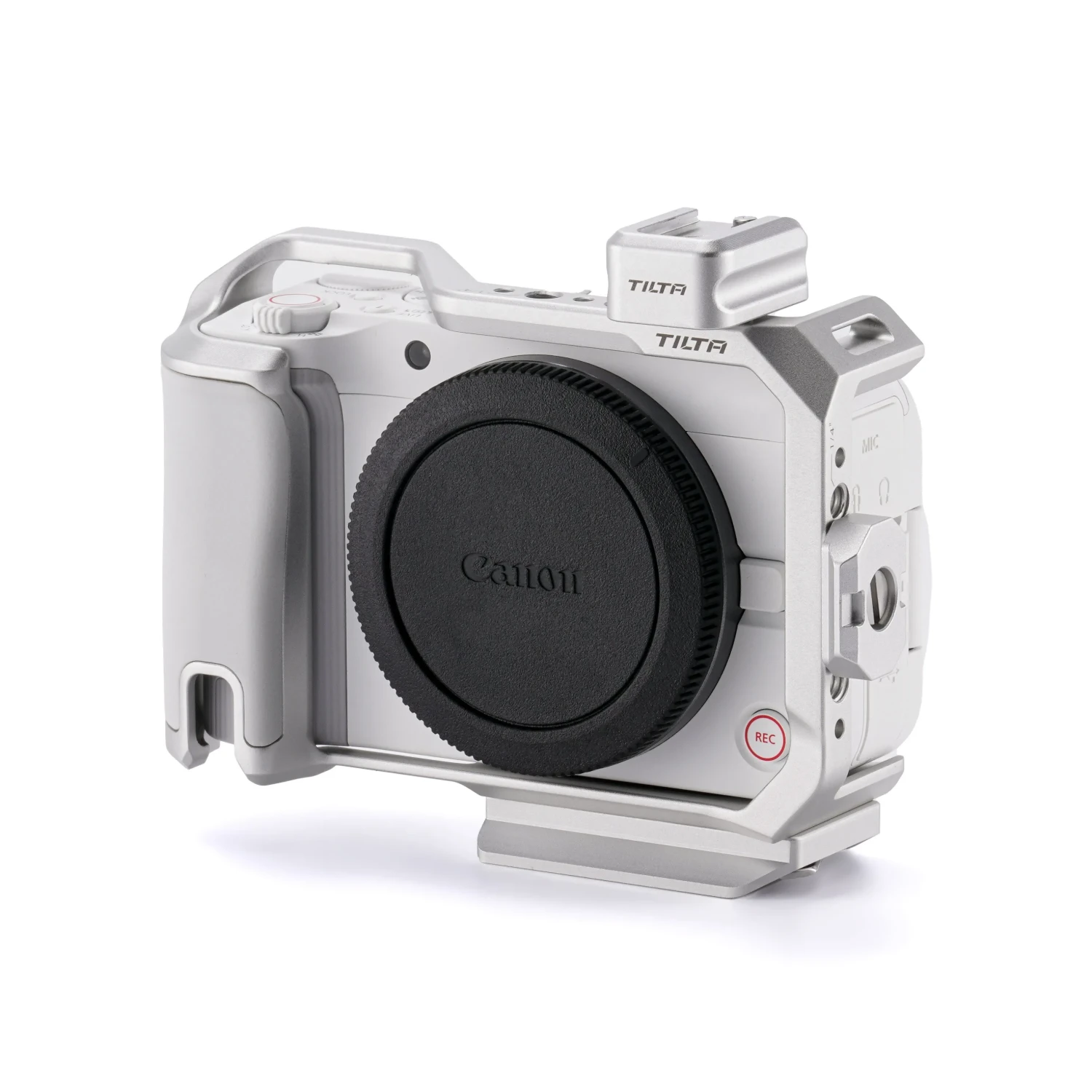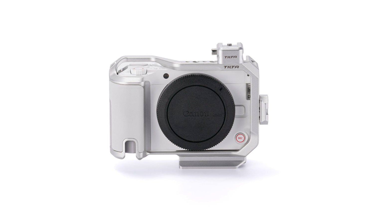 Bemutatjuk a Canon R50 V teljes kamerakeretét. Ez a kamerakeret extra védelmet nyújt a kamera testének, ugyanakkor számos külső kiegészítő felszerelésére is lehetőséget biztosít többféle rögzítési lehetőség révén, beleértve a hideg cipőfoglalatot, a NATO sín és a ¼”-20 menetes rögzítési pontokat.