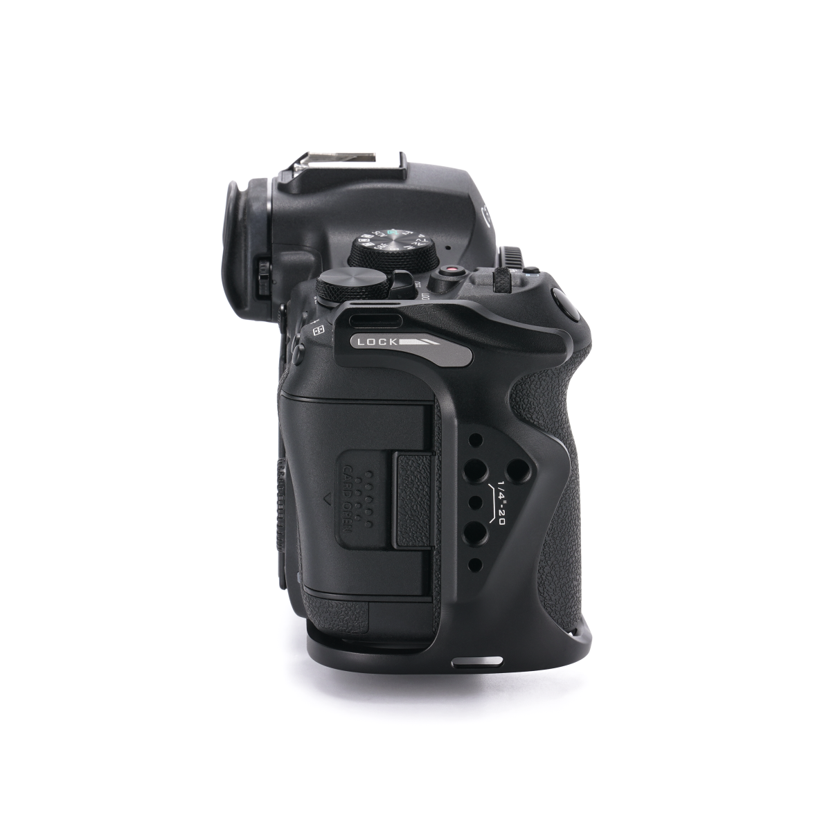 A teljes ketrecekkel ellentétben ez a félketrec biztonságos kétpontos rögzítési rendszert alkalmaz az alján és a markolat területén, ami csavarokkal rögzített, csörgésmentes illeszkedést biztosít. Nem akadályozza a kamera funkcióit, beleértve az LCD-képernyőhöz való hozzáférést, a vakupapucsot vagy a memóriakártya-nyílásokat. A fekete eloxált felület ellenáll a korróziónak és professzionális matt megjelenést biztosít, amely illeszkedik a modern kamerák esztétikájához.