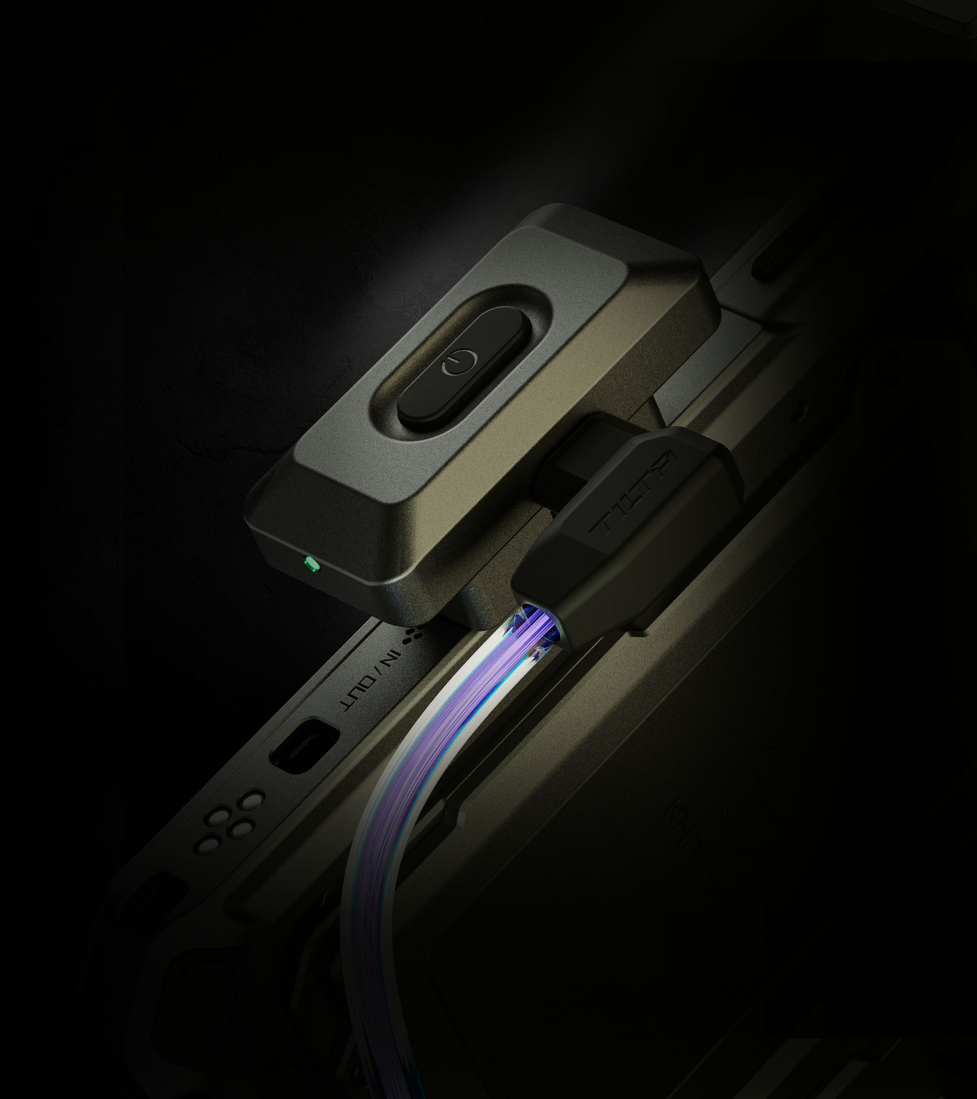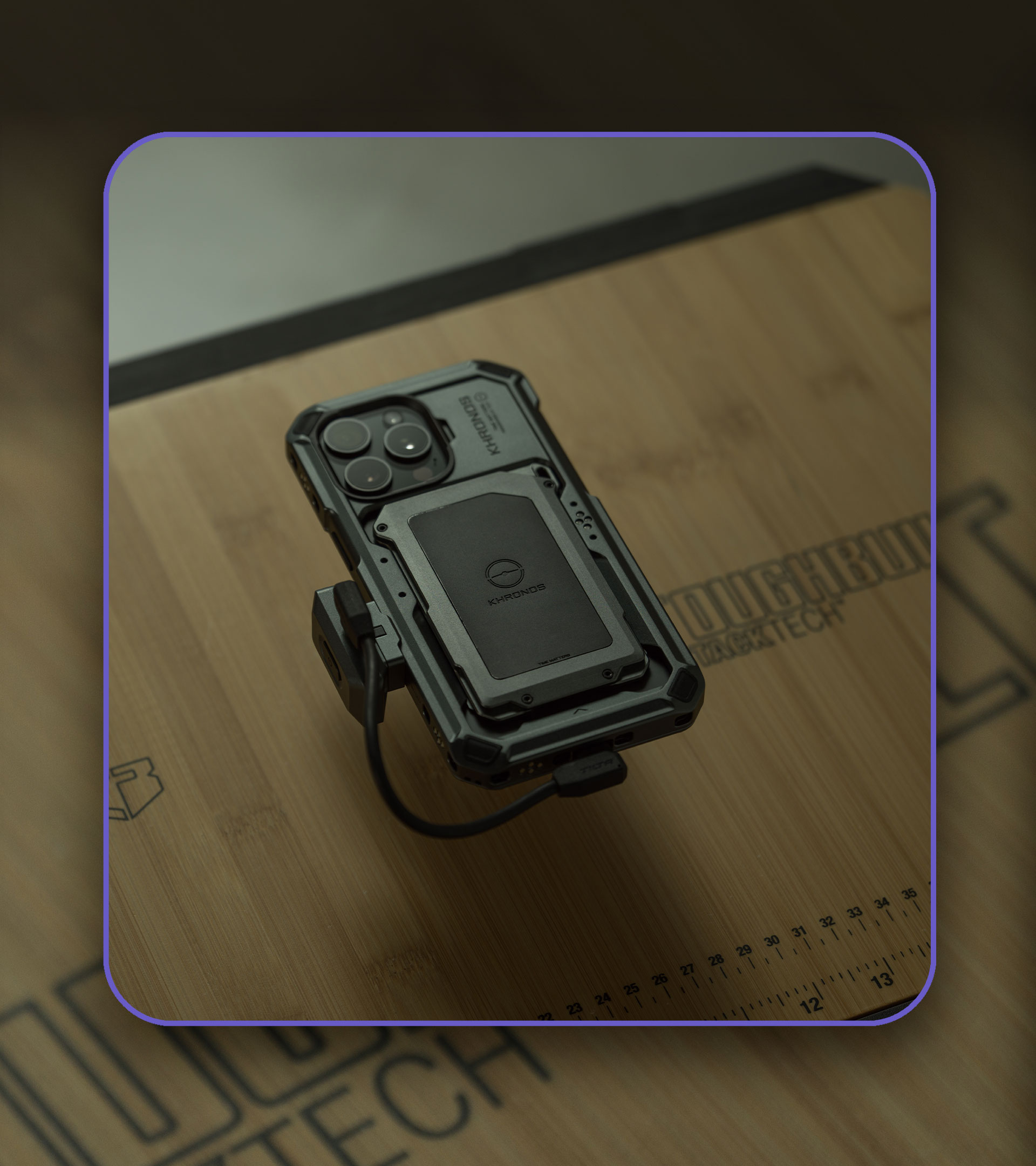 Ez a tartozék a Khronos Case for iPhone-on található gyorskioldó csatlakozón keresztül rögzíthető, és a mellékelt USB-C kábelen keresztül csatlakozik az iPhone 15 Pro és Pro Max készülékhez.