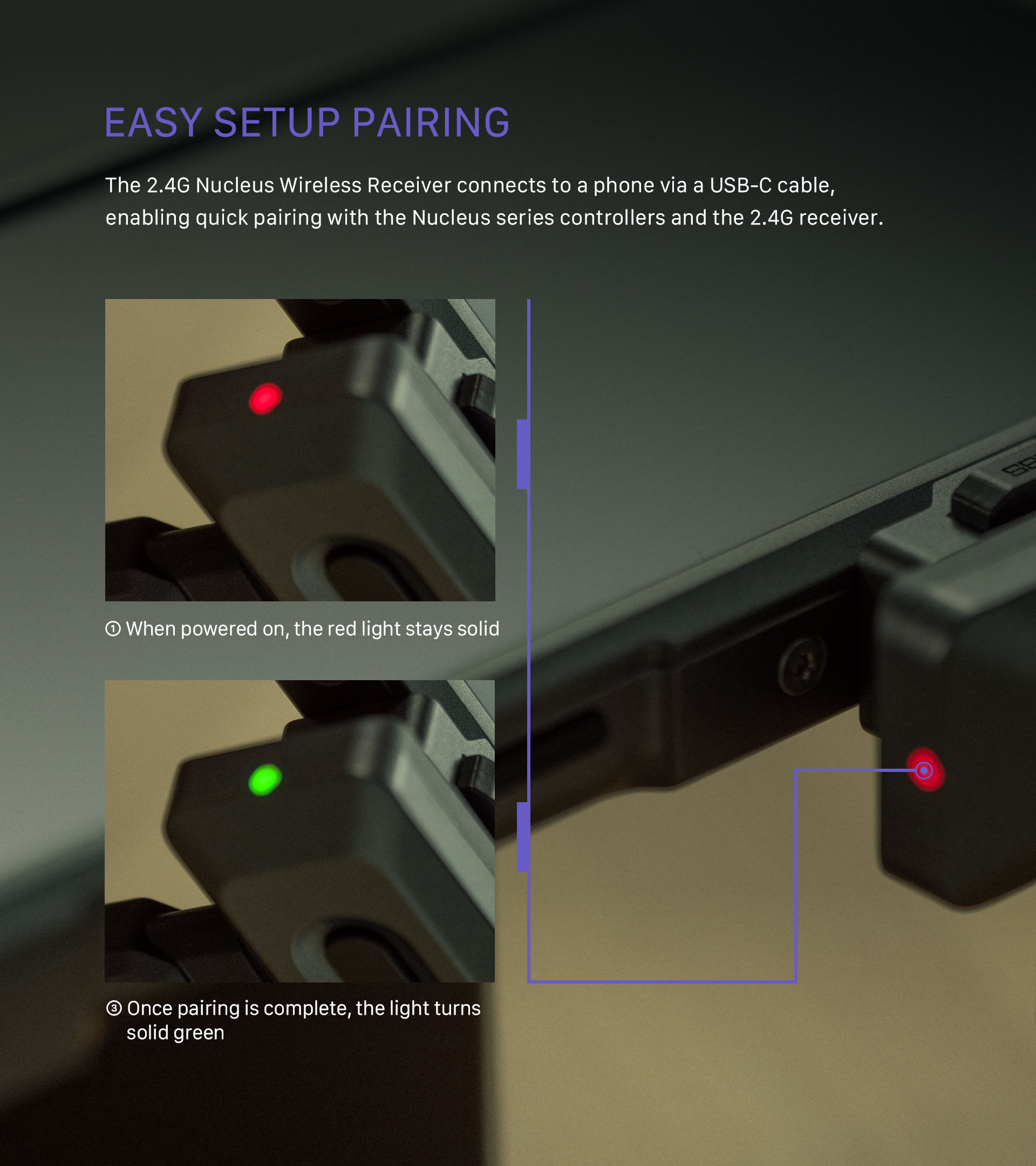 A felhasználók ezután 2,4G-n keresztül párosíthatják a Nucleus Nano II kézikereket, hogy a Black Magic alkalmazáson keresztül vezérelhessék a fókuszt és a zoomot.