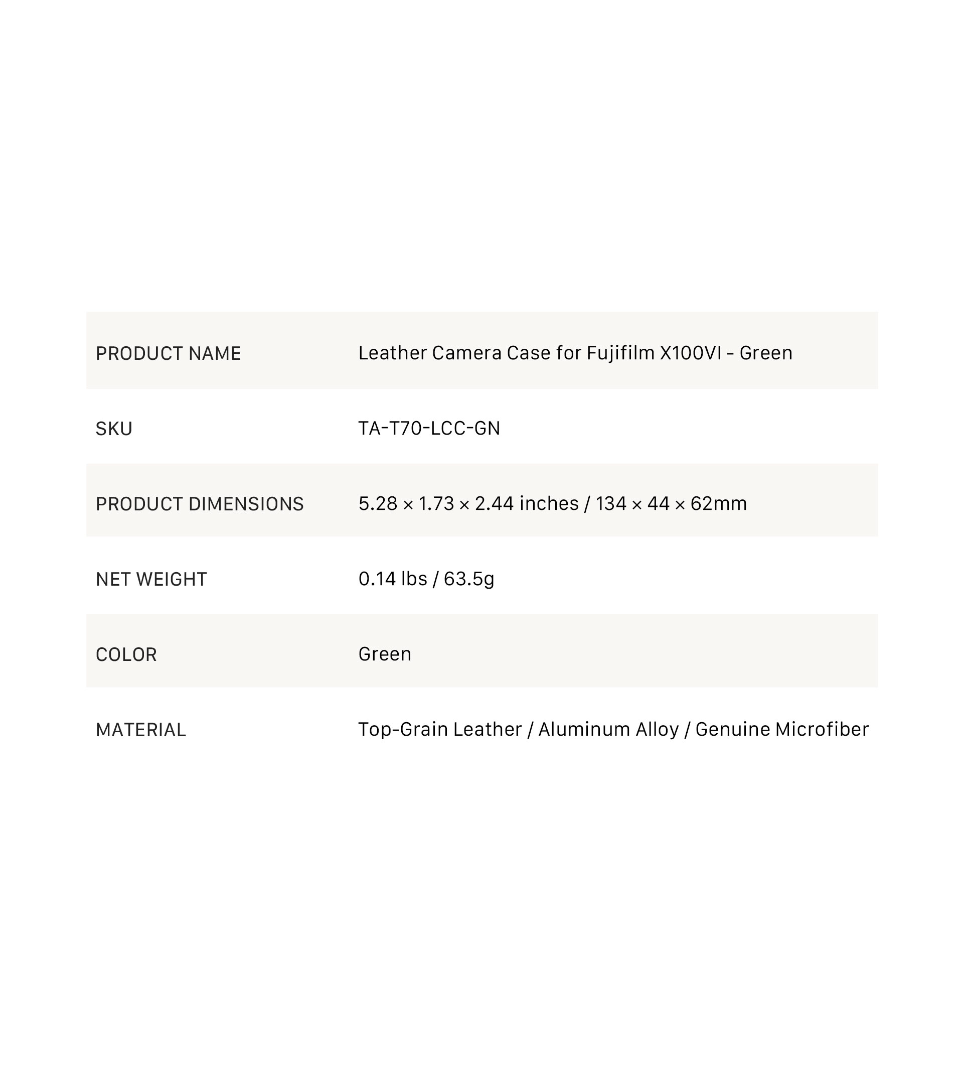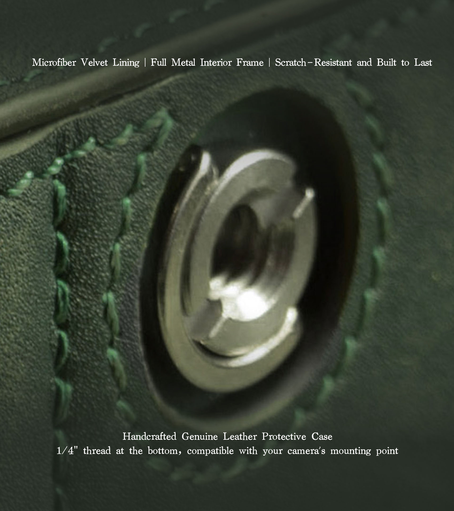 Bemutatjuk a Fujifilm X100VI bőr fényképezőgép tokot. Ez a tok egy 1/4″-20-as csavarral rögzíthető, és a beépített markolaton keresztül kényelmesebb kezelési módot biztosít a felhasználók számára a fényképezőgép testének működtetéséhez és kezeléséhez. A kialakítás emellett további védelmet nyújt a fényképezőgépváz aljának, ami különösen hasznos a fényképezőgép lehelyezésekor.