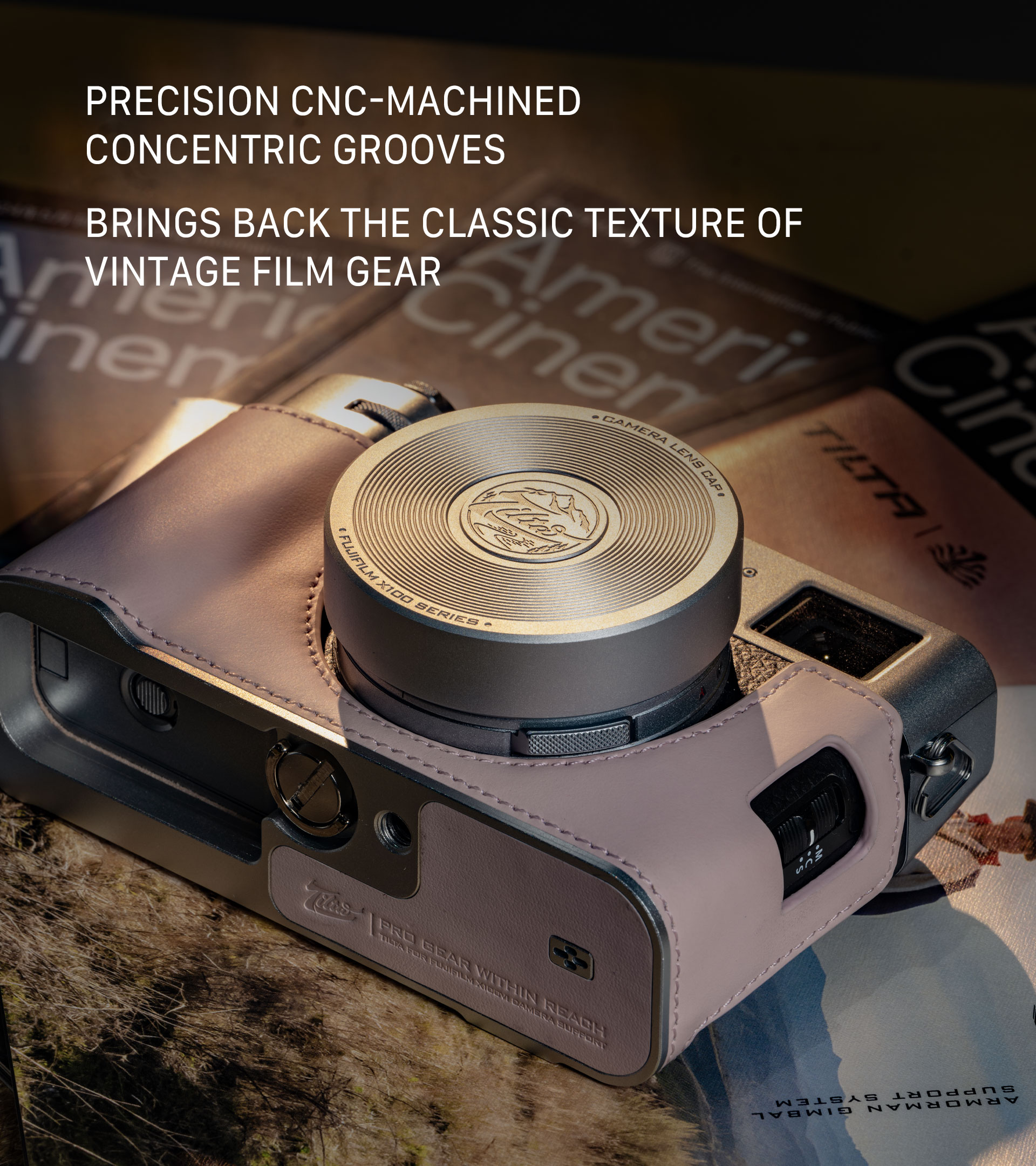 A precíz CNC megmunkálással készült objektívsapka finom részletességű koncentrikus hornyokkal rendelkezik, amelyek tapintható, texturált érzetet nyújtanak, felidézve a klasszikus filmes fényképezőgépek klasszikus eleganciáját.