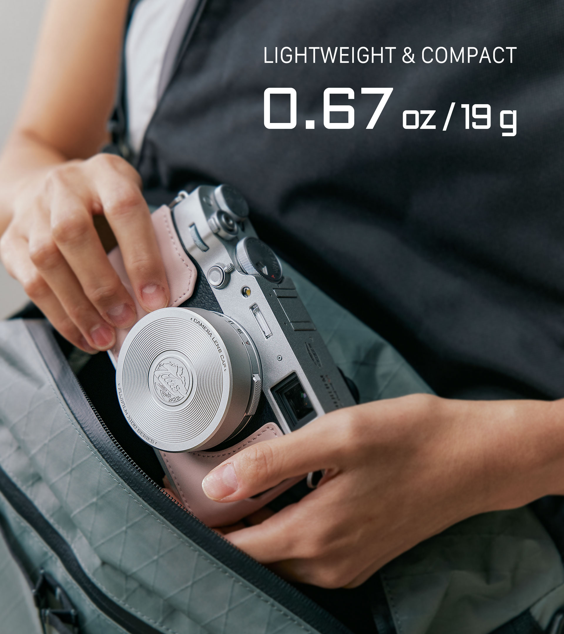A mindössze 19 gramm (0,67 uncia) súlyú, könnyű, mégis tartós sapkát úgy tervezték, hogy zökkenőmentesen illeszkedjen a fényképezőgép objektívjéhez és védje azt.