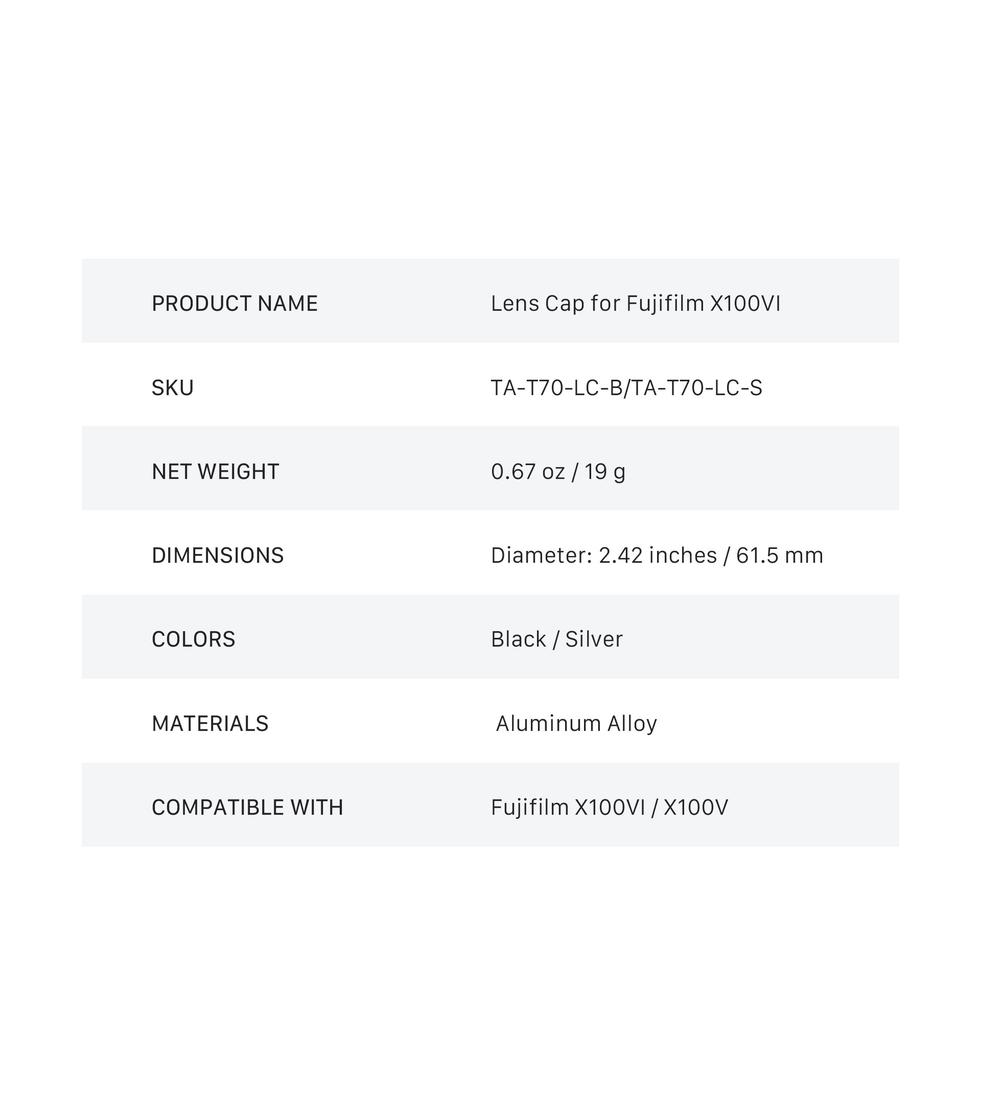 Védje stílusosan Fujifilm X100VI vagy X100V fényképezőgépét prémium objektívsapkánkkal, ahol a modern kézművesség találkozik a vintage bájjal. A mindössze 19 gramm (0,67 uncia) súlyú, könnyű, mégis tartós kupakot úgy tervezték, hogy zökkenőmentesen illeszkedjen a fényképezőgép objektívjéhez és védje azt.