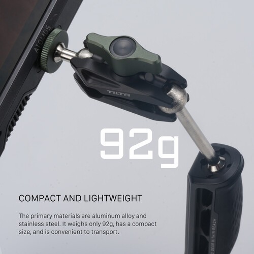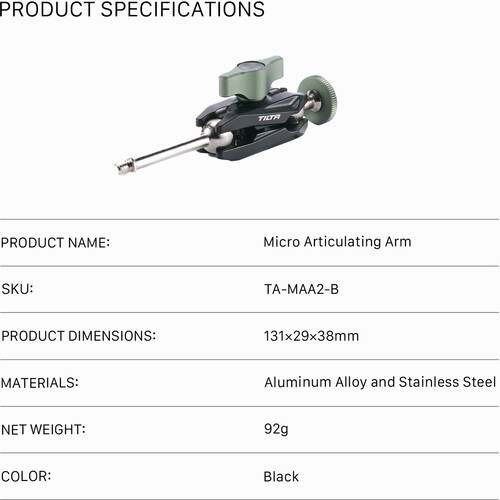 A Tilta Micro Articulating Arm egy kompakt és sokoldalú, 5,2 hüvelykes kar, amelyet monitorok vagy lámpák és más kiegészítők kamerarigshez való rögzítésére terveztek. Tartós alumíniumötvözetből és acélból készült, mindkét végén 1/4"-20-as csavarral rendelkezik, teherbírása 5 font.