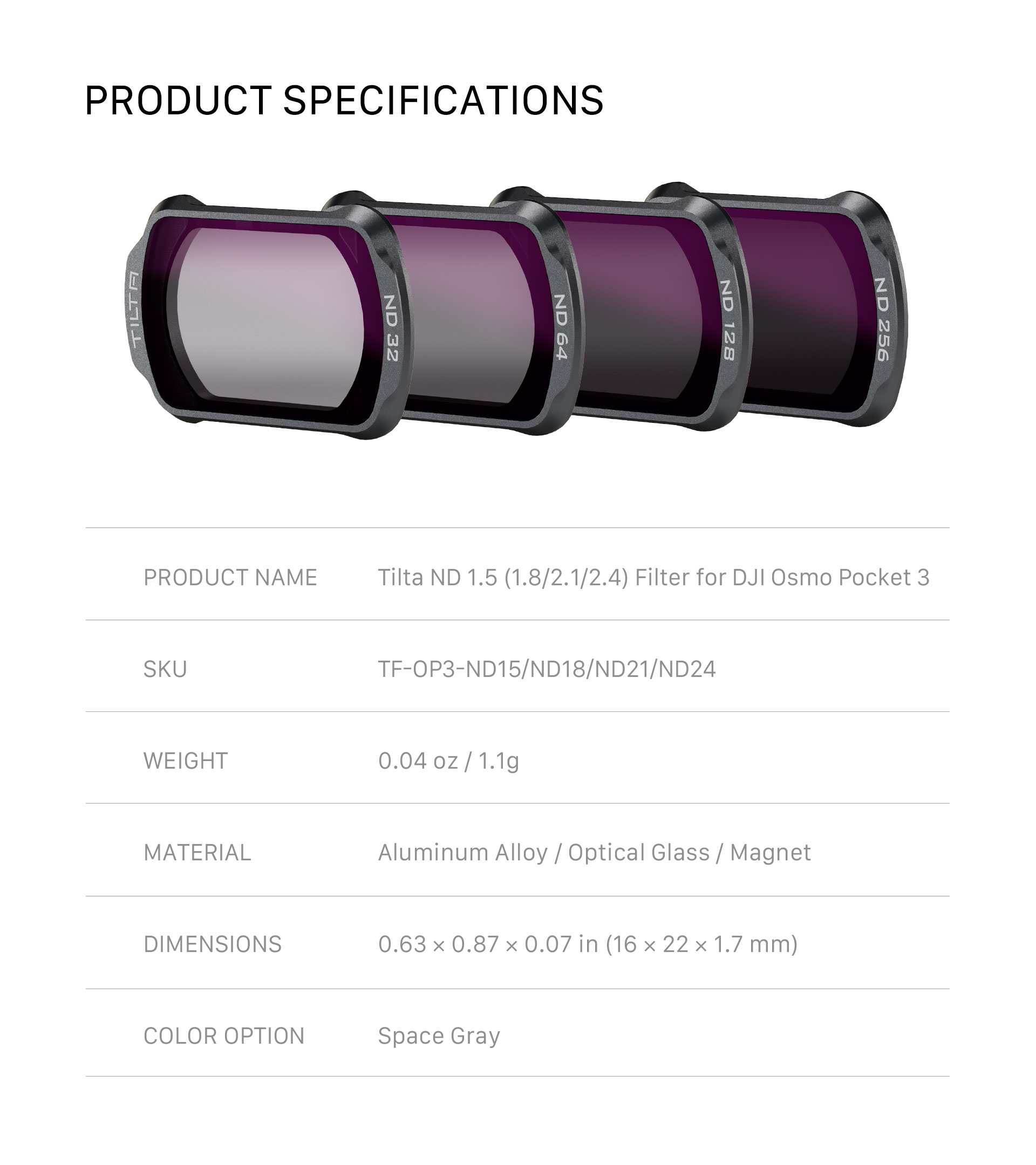 A Pocket 3 számára egyedileg tervezett szűrők mágneses csatlakozással rendelkeznek a könnyed csatlakoztatás érdekében, míg a Quick-Release Groove Design gyors, csípéssel eltávolítható hozzáférést tesz lehetővé. Ez a szűrő a semleges fénysűrűség különböző szintjeivel áll rendelkezésre, így a felhasználók nagyobb kontrollt kapnak az expozíció felett.