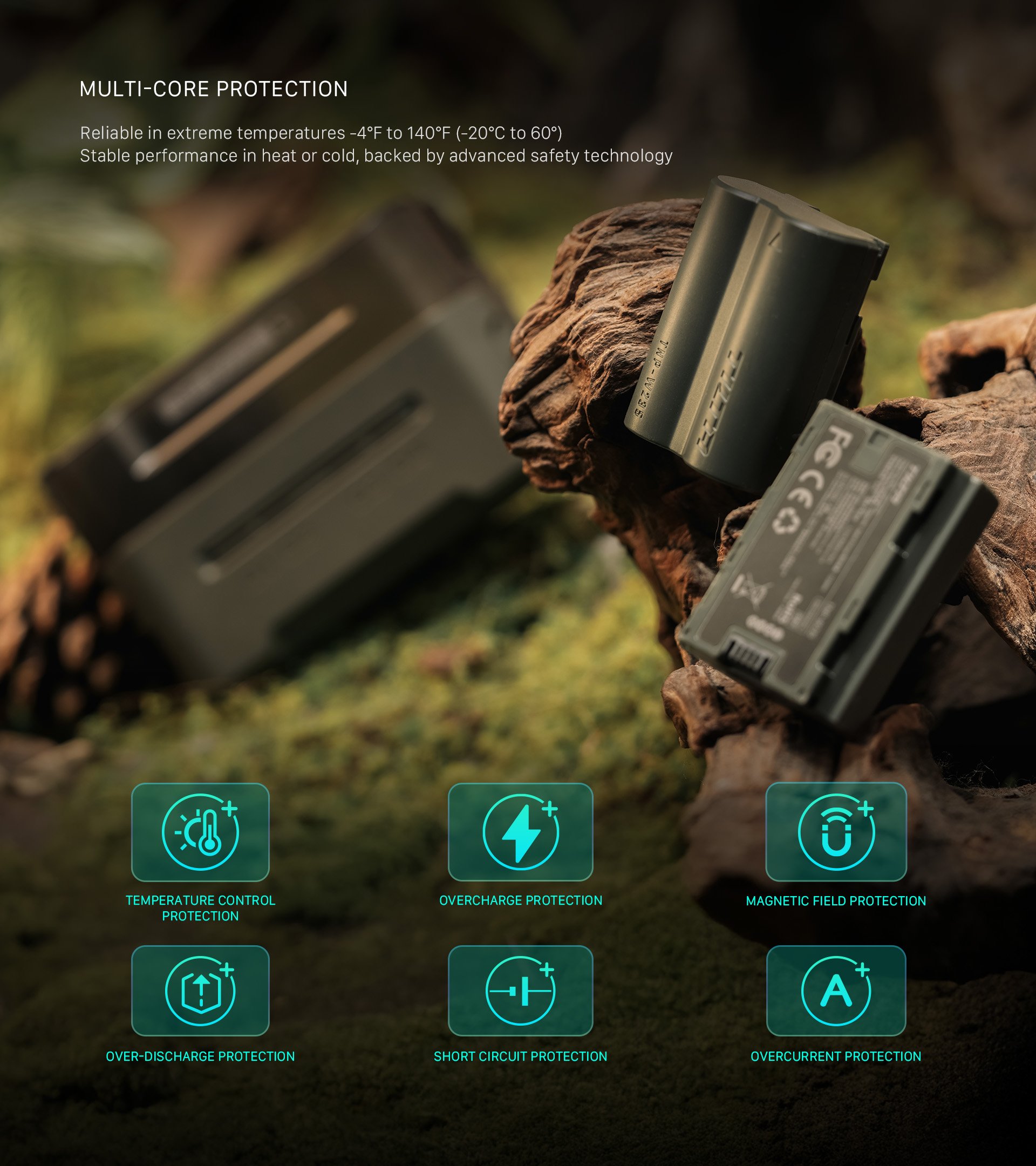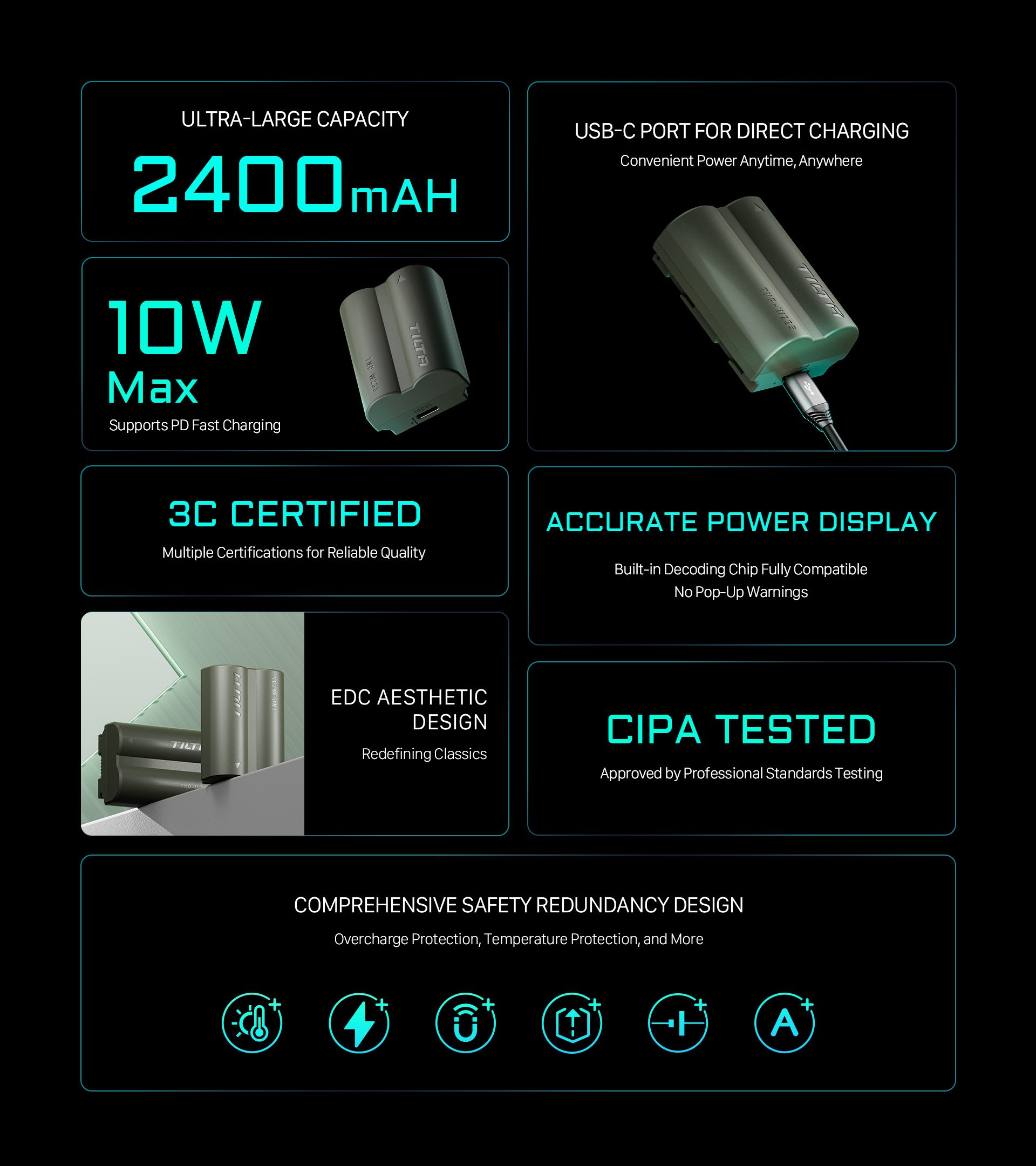 Az eredetivel megegyező méretekkel zökkenőmentesen illeszkedik fényképezőgépébe, így tökéletes kompatibilitást biztosít. Több nemzetközi biztonsági tanúsítvánnyal is rendelkezik (CCC, FCC, CE, PSE, KC, UL, BSMI), így nyugalmat és megbízható védelmet nyújt.
