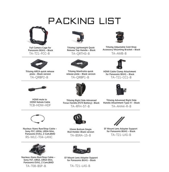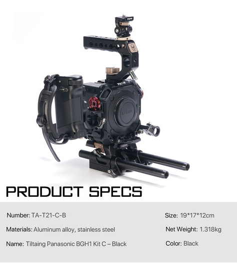 A Tilta TA-T21-C-B kamera keretkészlet C (fekete) egy komplett, felvételkész moduláris szerelvény a Panasonic LUMIX BGH1/BS1H dobozkamera számára, amely minimalista, elülső teljes keretet, 15 mm-es LWS alaplemezt rudakkal, EF-mount EF adaptertartót, L-sorozatú Nucleus-Nano fókuszfogantyút R/S-sel, feszesség-állítható monitor tartóval, Arca + Manfrotto QR lemezekkel, HDMI kábellel + bilincsel és egyrúd tartóval – mindennel, amire szükség van, hogy a BGH1-et teljesen felszerelt filmes munkagéppé alakítsa.