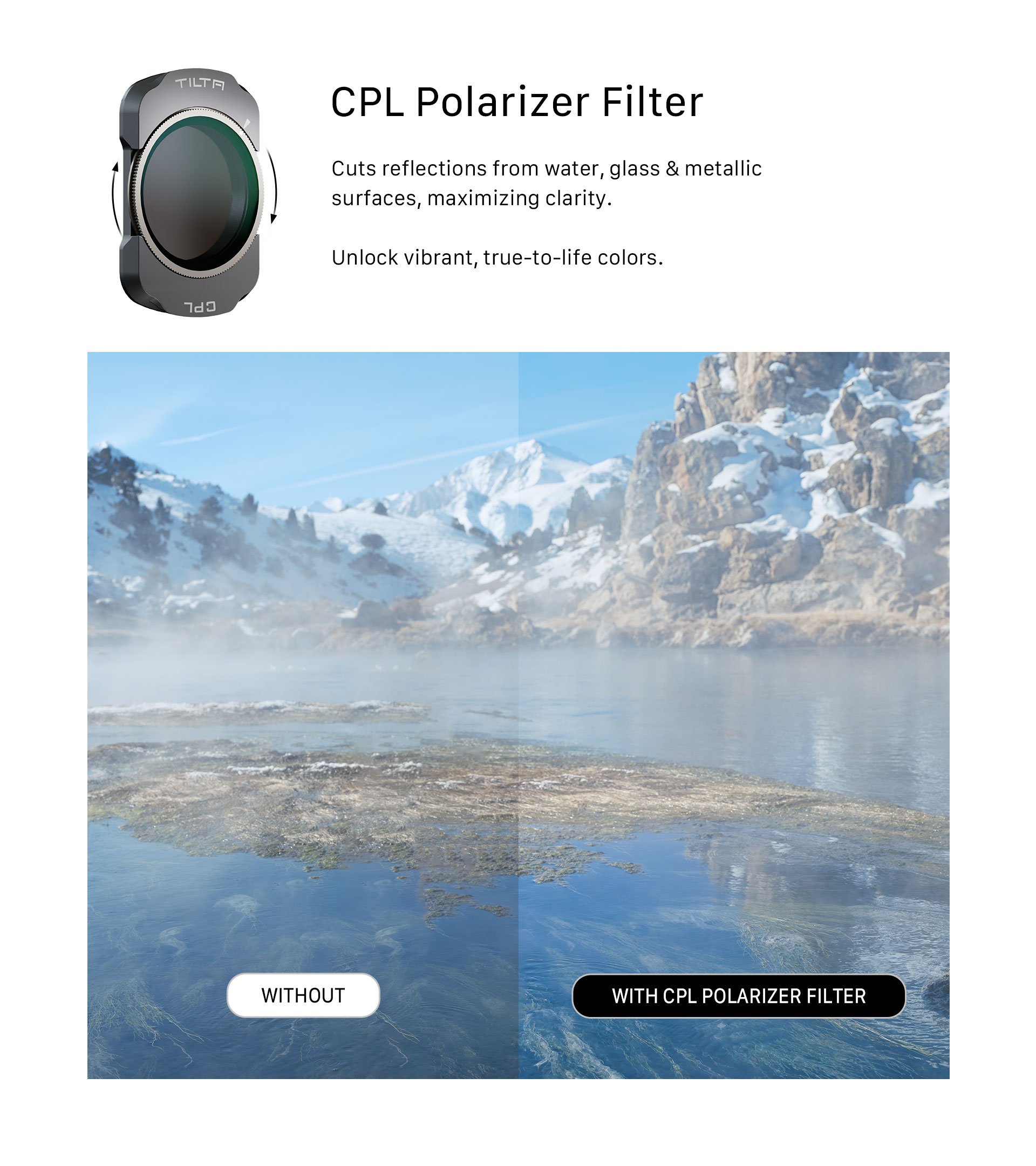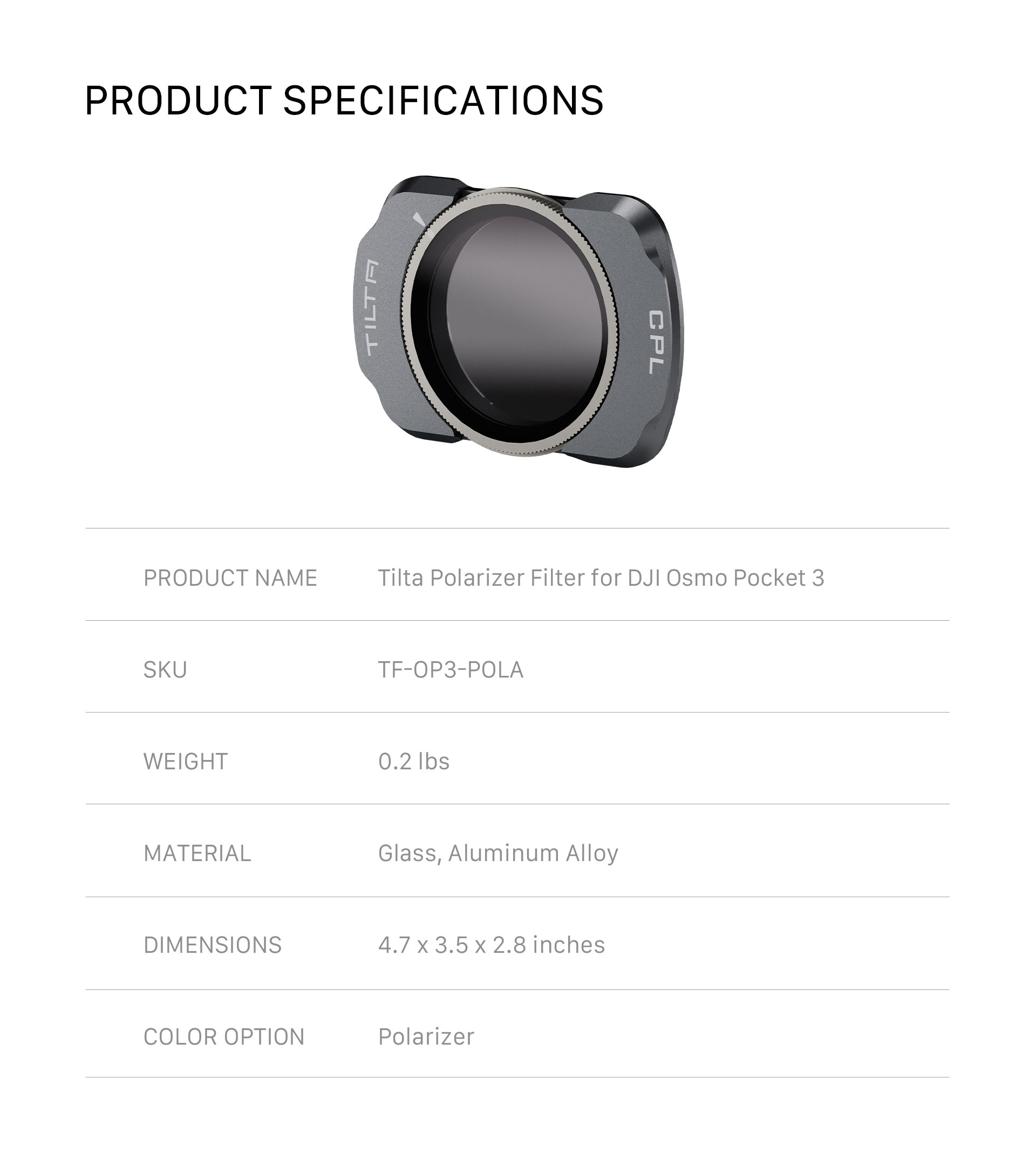 Ezt a szűrőt a Pocket 3 készülékhez tervezték, és mágneses csatlakozással rendelkezik a könnyed csatlakoztatáshoz, míg a Quick-Release Groove Design gyors, csípéssel eltávolítható hozzáférést tesz lehetővé. Pontos és élénk színeket képes előállítani a visszavert fény korlátozásával és az olyan tükröződő felületek, mint a víz vagy az üveg okozta nem kívánt tükröződés megakadályozásával.