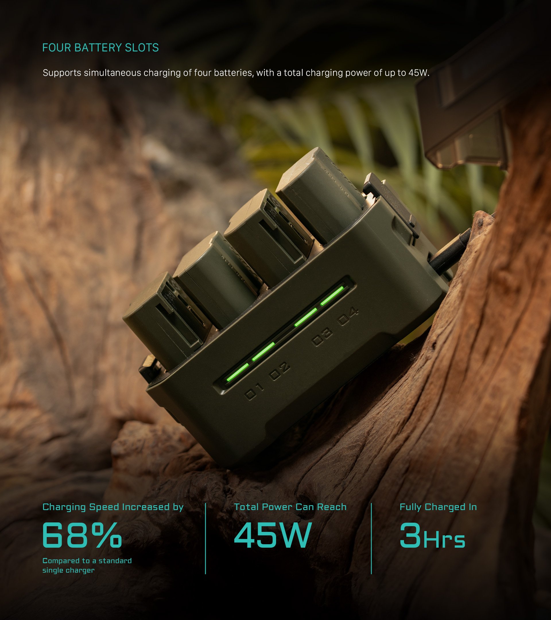 Ez a kompakt töltőállomás a Nikon és a harmadik féltől származó EN-EL15C akkumulátorok támogatására készült, és négy rekeszt kínál az egyszerű töltéshez és a kényelmes tároláshoz. A 45 W-os PD gyorstöltéssel felszerelt töltő lenyűgöző, 68%-kal gyorsabb töltési sebességet biztosít, mint egy hagyományos egyszemélyes töltő, így az akkumulátorok mindössze 3 óra alatt készen állnak az akcióra.