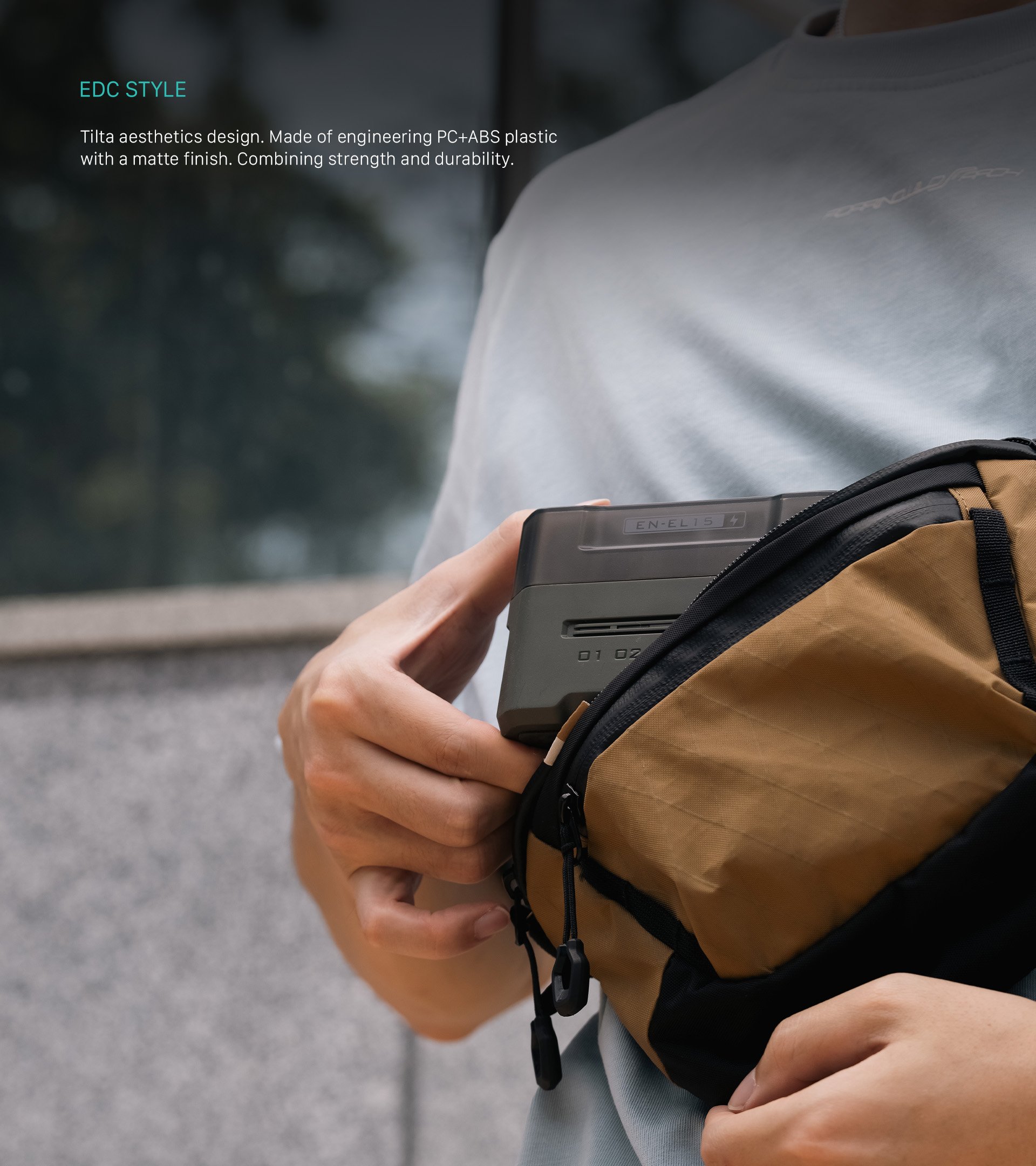A Tilta hordozható töltőállomás EDC-stílusú kialakítással rendelkezik, a Tilta jellegzetes esztétikájával, így stílusos és funkcionális kiegészítője felszerelésének.