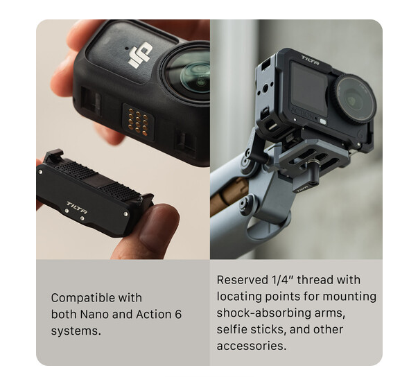 A Tilta gyorskioldó rögzítőalaplap a DJI Osmo Action 6 és Nano kamerákhoz gyors, biztonságos és könnyű rögzítési megoldást kínál azoknak a kreatív alkotóknak, akiknek dinamikus felvételi körülmények között gyorsaságra és rugalmasságra van szükségük. A DJI Osmo Action 6 és Nano kamerákhoz kifejezetten tervezett alaplap mágneses gyorskioldó csatlakozással rendelkezik, amely lehetővé teszi a kamera szerszámok nélküli, azonnali rögzítését és eltávolítását.