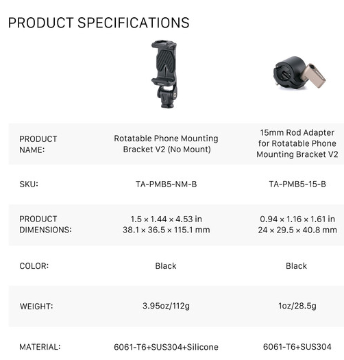 A Tilta TA-PMB5-15K-B forgatható telefon tartókonzol V2 15 mm-es rúddal egy professzionális okostelefon-rögzítő (3–3,8 hüvelyk széles telefonokhoz alkalmas), teljes 360°-os forgathatósággal és szilikon párnázott pofákkal, egy 15 mm-es rúdadapterrel, csavarodásgátló rögzítőcsapokkal – ideális a telefon rögzítéséhez rendezői monitor, vezeték nélküli vevő kijelzőként vagy gimbal ellensúlyként közvetlenül bármely 15 mm-es LWS rúdszerkezetre vagy a Hydra Alien Mini középső karra.