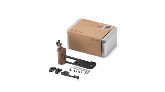 A készlet alapja egy L-tartó, diófából készült fa markolattal, amely kényelmesebb kezelést és a fényképezőgép kezelését teszi lehetővé.