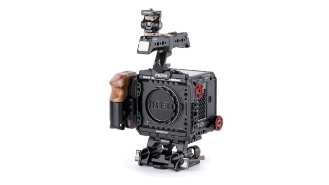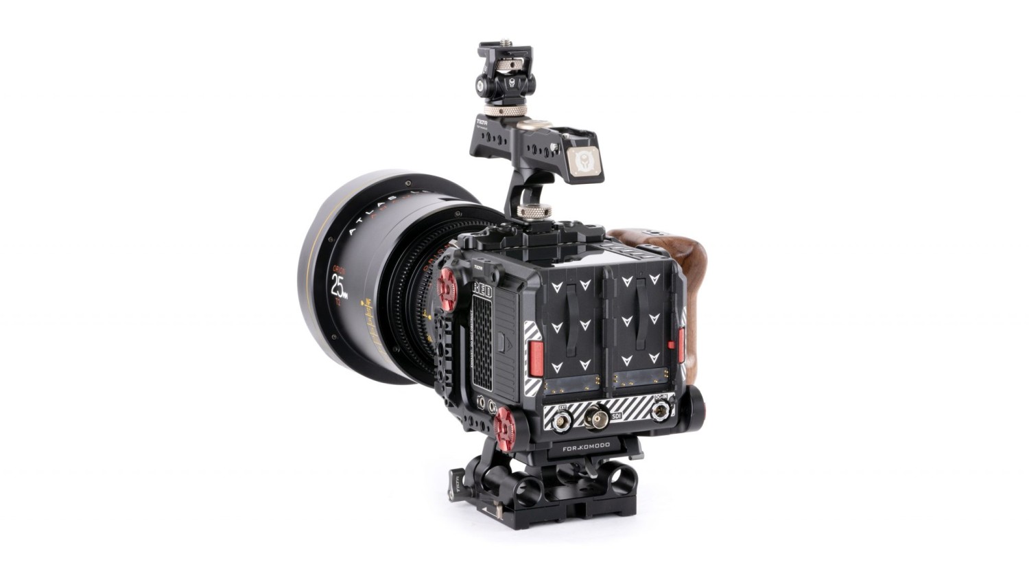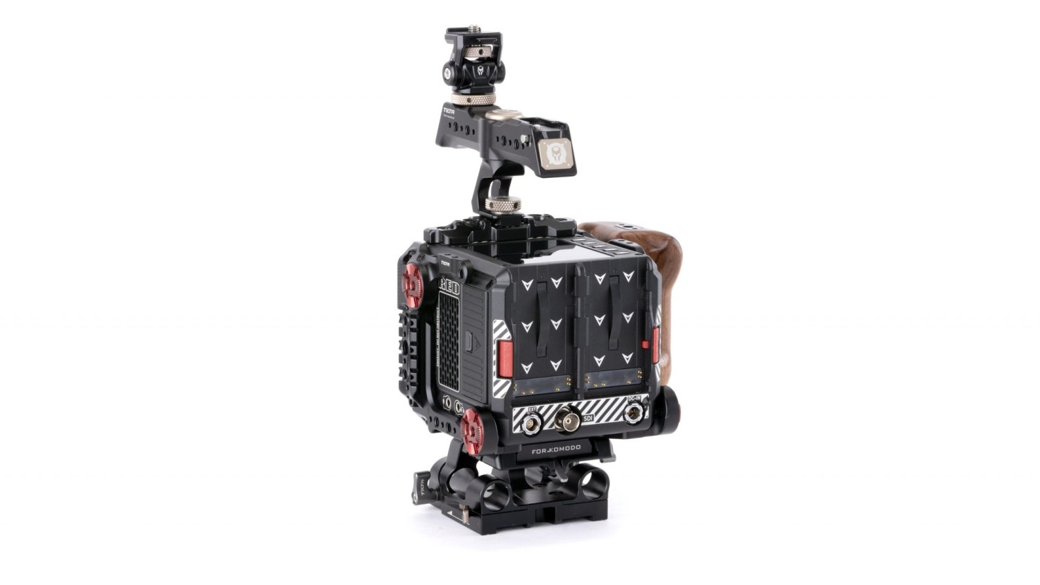 A RED Komodo kameraketrec ezen készlete a következőket tartalmazza: RED Komodo alapketrec, jobb oldali fa fogantyú, gyorskioldó felső fogantyú, Arca és Manfrotto gyorskioldó alaplapok, 15 mm-es LWS alaplap és állítható Cold Shoe tartozéktartó tartó.