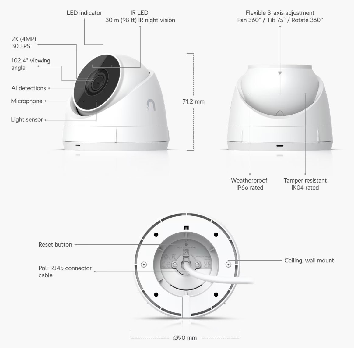 Az UVC-G5-Turret-Ultra az UniFi Video sorozat 5. generációs kamerája. 1/2,4" CMOS érzékelővel rendelkezik, felbontása 4 MP (2688 x 1512 px, 16:9) @ 30 FPS. A fix objektív látószöge vízszintesen 102,4°, függőlegesen 54,9° és átlósan 120,6°. A kamera mikrofonnal (letiltható) és (1) 10/100 Mbps Ethernet porttal rendelkezik, amelyen keresztül a kamera POE 802.3af vagy passzív POE segítségével 37–57 V DC bemeneti feszültséggel táplálható. Éjszakai üzemmódhoz a kamera 30 m hatótávolságú IR-megvilágítással rendelkezik. Maximális fogyasztása mindössze 4 W!