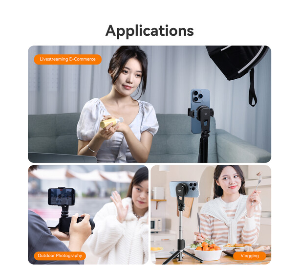 A MagSafe-kompatibilis mágneses lemez mind függőleges, mind vízszintes tájolást támogat, 360°-os elforgatással a portré és tájkép módok közötti zökkenőmentes váltáshoz. A 180°-os dőlésszög (-90° és 90° között) pontos szögbeállítást biztosít, így könnyen beállíthatja a felvételeket pontosan úgy, ahogyan szeretné.
