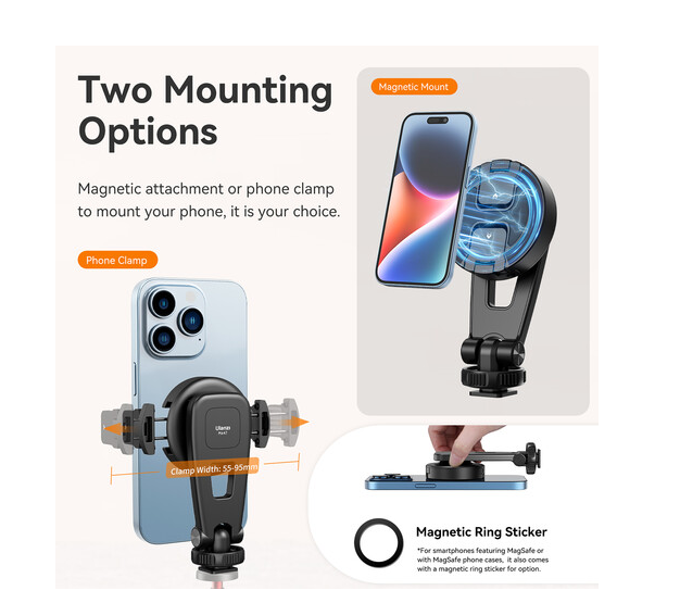 Könnyű, mégis tartós, ez a 2 az 1-ben mágneses okostelefon-tartó hordozhatóságot, rugalmasságot és gyors beállítást kínál a mindennapi tartalomkészítéshez.