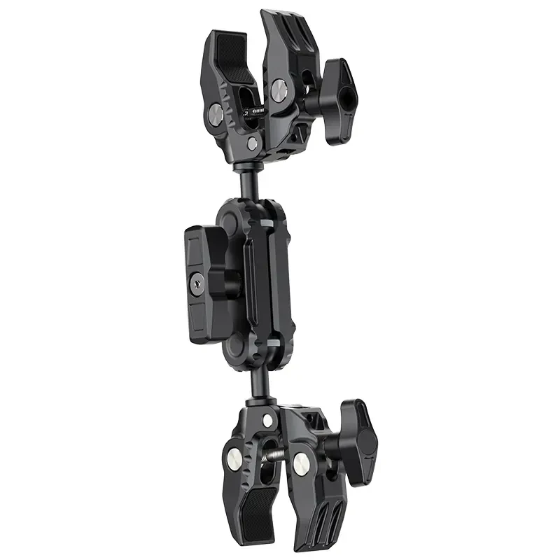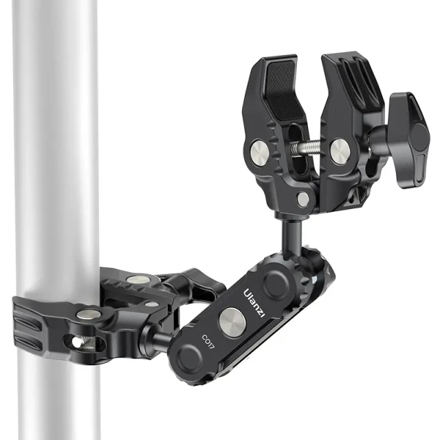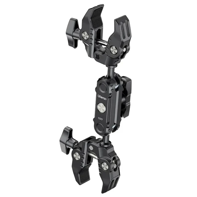 Ulanzi CO17 Super Clamp kettős gömbfejű mágikus karral. Ez a sokoldalú Super Clamp könnyen rögzíthető motorkerékpárokra, kerékpárokra, állványokra, asztalokra és egyebekre. Csúszásgátló kialakítása biztosítja a biztonságos rögzítést 1,2 cm és 5,8 cm szélességű felületeken. A kettős gömbfej 360°-os rugalmas beállítást tesz lehetővé, így sokoldalú felvételi szögeket biztosít. A gömbfejek cseréjével bővítheti a lehetőségeket, 3,5 kg teherbírással. Könnyű, mégis tartós alumíniumötvözetből készült, így utazáshoz és mindennapi használatra is tökéletes. Szuper rugalmasságot biztosító szuper bilincs.