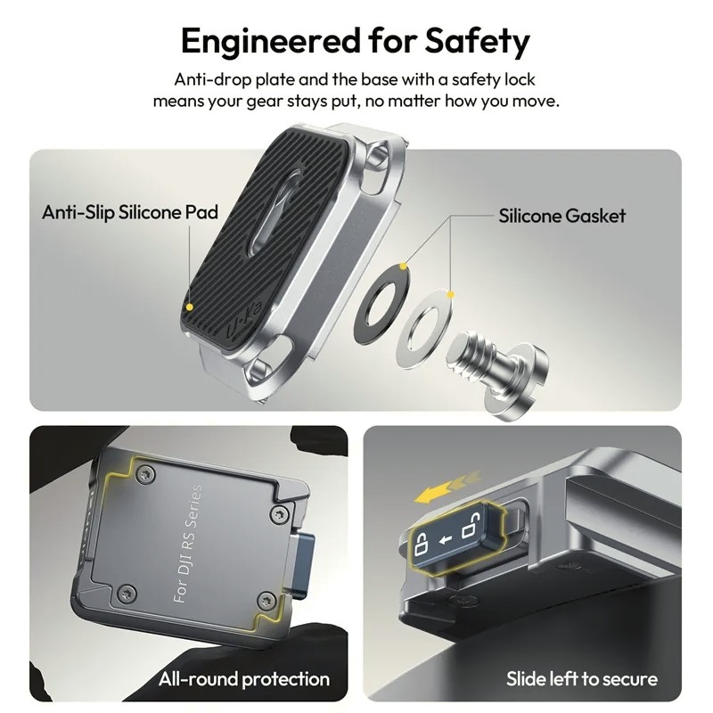 A becsúsztatható szerelési kialakításnak köszönhetően a kamera lemez beépített biztonsági zárral és leesésgátló mechanizmussal biztonságosan rögzül az alaphoz, így a kamera dinamikus mozgás közben is szilárdan a helyén marad. A C061 teljes mértékben kompatibilis az Uka és F38 gyorskioldó lemezekkel, így könnyedén válthat gimbalok, állványok, válltartók és egyéb tartó rendszerek között.