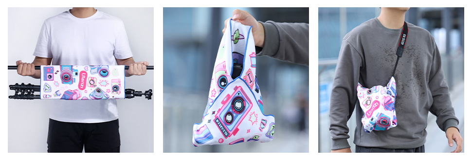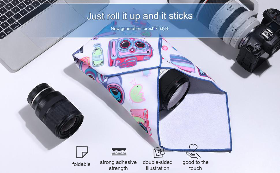 A kamerakendő speciális szálszerkezetű, amely a felülethez és a kendő hátuljához tapad, ha egymásra rakják. A közepes vastagság extra védelmet nyújt az ütések és a dörzsölés ellen. A bélés kevert anyagból készült, amely kellemes tapintású és könnyen tárolható.