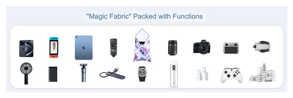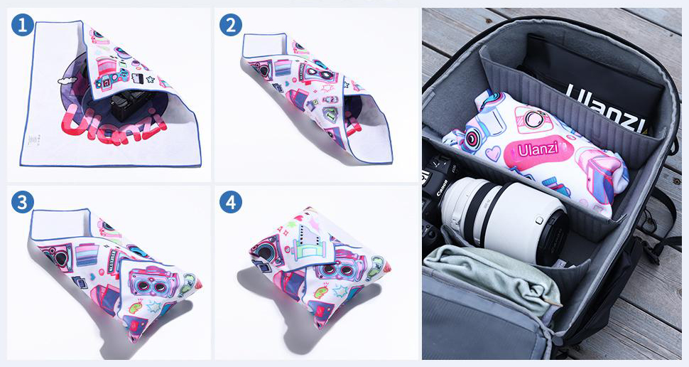 A négyzet alakú bélésszövet mérete 450 x 450 mm, és olyan védőszövet, amelyet könnyen bármilyen formára lehet tekerni anélkül, hogy meg kellene kötni. Csomagolja be ebédjét, kozmetikumait, műanyag palackjait, összecsukható esernyőit, valamint digitális eszközeit, például fényképezőgépeket, objektíveket, szűrőket, kézi stabilizátorokat, táblagépeket stb.