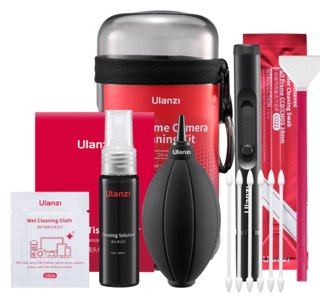 Az Ulanzi CO28 26-in-1 kameratisztító készlet egy komplett tisztító megoldás teljes képkocka méretű kamerákhoz és precíziós optikákhoz. 26 alapvető eszközzel ellátott, kompakt tokban biztonságosan eltávolítja a port, ujjlenyomatokat, foltokat és vízfoltokat – tökéletes választás utazó fotósok és alkotók számára.