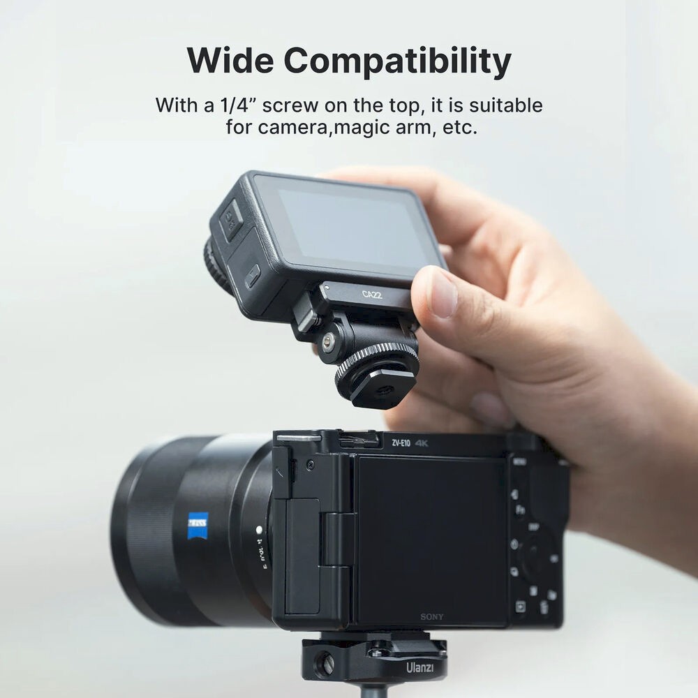 Az Ulanzi hideg cipőfoglalat-adapter egy kompakt és tartós rögzítési megoldás , amelyet kifejezetten a DJI Osmo Action 3, Action 4 és Osmo Pocket 3 kamerákhoz terveztek, és amely a kompatibilis Ulanzi bővítőadapterrel (külön megvásárolható) párosítva használható . Lehetővé teszi a felhasználók számára, hogy kamerájukat közvetlenül a hideg cipőfoglalatra rögzítsék, így ideális kamerakamrák, mágikus karok, mikrofonok és világítási berendezések használatához.