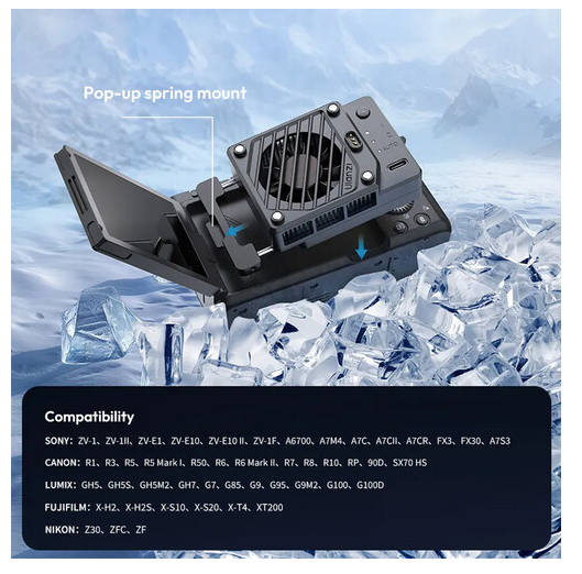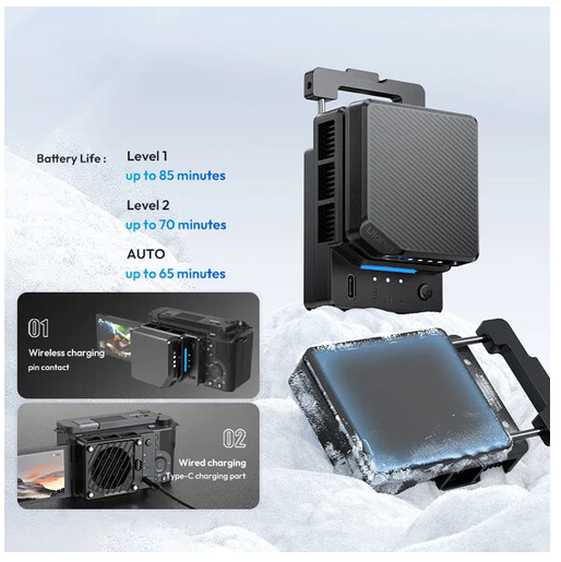 Az Ulanzi CU01 termosztatikus félvezető kamerahűtő akkumulátorral úgy lett kialakítva, hogy hatékony hőkezeléssel védje kameráját a hosszú felvételek során. A legtöbb flip-screen kamerával kompatibilis, rugós rögzítéssel rendelkezik, amely gyors és biztonságos rögzítést biztosít anélkül, hogy károsítaná a készüléket. A fejlett félvezető hűtőrendszer 71 PN csatlakozási párral rendelkező hőmérsékletmérő chipet és egy nagy teljesítményű, 5000 RPM-es ventilátort tartalmaz, amely gyors és hatékony hőelvezetést biztosít.