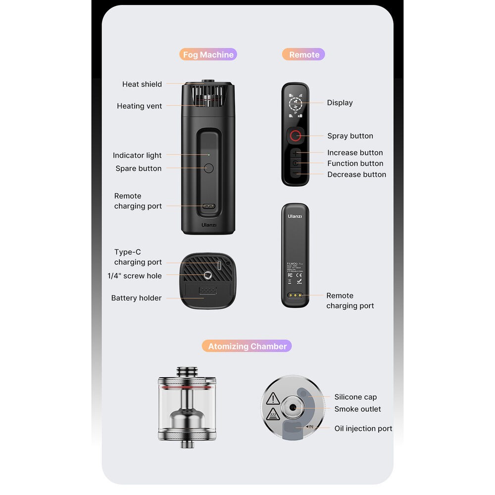 Az FM01 egyszerű felülettel és színes képernyővel rendelkezik, amely megkönnyíti a módok kiválasztását és beállítását. Tartalmaz egy 2,4 GHz-es vezeték nélküli távirányítót, amely lehetővé teszi a köd kibocsátását akár 10 méter távolságból is. A gép két 18650-es akkumulátorral (nem tartozék) vagy USB-C töltéssel működik, rugalmas tápellátási lehetőségeket és akár 50 perc üzemidőt biztosítva.