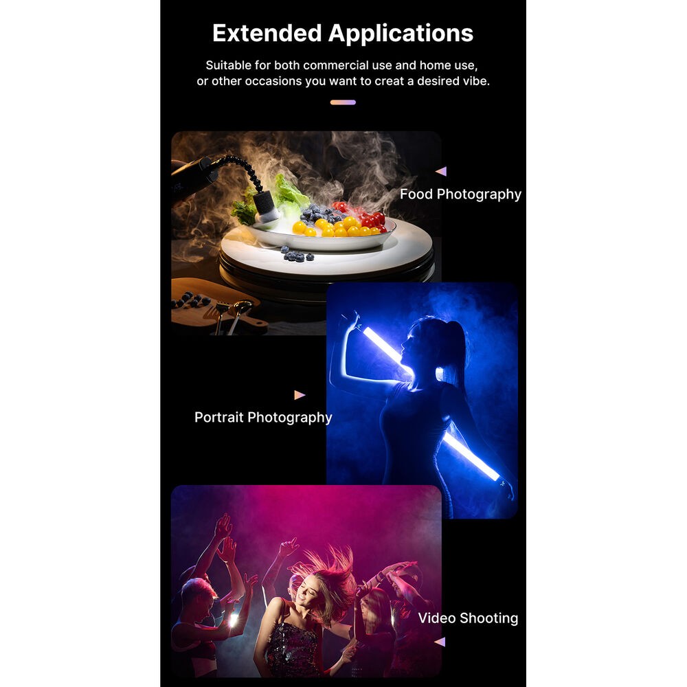 A kényelmet és a biztonságot szem előtt tartva tervezett FM01 szagtalan, élelmiszerbiztonságos és megakadályozza a túlmelegedést. A 1/4"-20 menetes rögzítés lehetővé teszi a könnyű felszerelést állványokra, állványokra vagy szerkezetekre, míg a mellékelt egyenes, ívelt és hajlékony csövek, szivacsszűrő és porlasztókamra precíz és sokoldalú ködképzést tesznek lehetővé. Minden alkatrész pontosan elfér a mellékelt hordtáskában, így ideális hordozható megoldás mozgásban lévő alkotók számára.