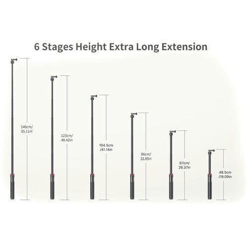 A Go-Quick II állvány hat fokozatban nyújtható, 48,5 cm-től 140 cm-ig, így magas szögből vagy távolról is lehet vele felvételeket készíteni. Összecsukva mindössze 29,3 cm-es, így kompakt és utazáshoz is alkalmas. ABS-ből és alumíniumból készült, könnyű, mégis tartós, súlya mindössze 332 g. Ideális vlogoláshoz, extrém sportokhoz, élő közvetítéshez és kültéri felvételekhez. Ez az állvány stabilitást, hordozhatóságot és sokoldalúságot biztosít minden felvételi helyzetben.