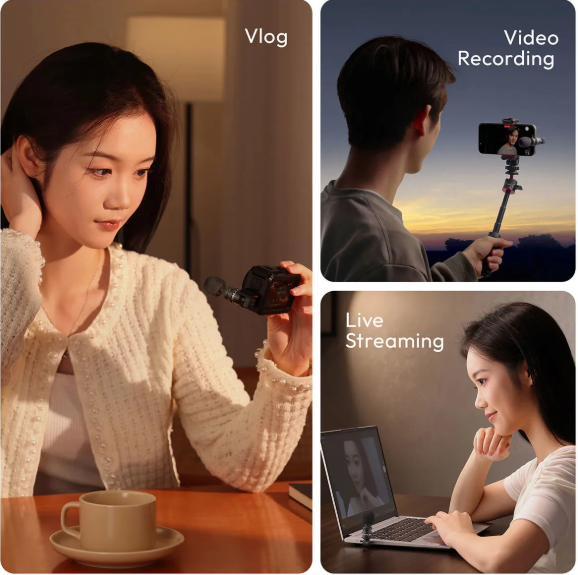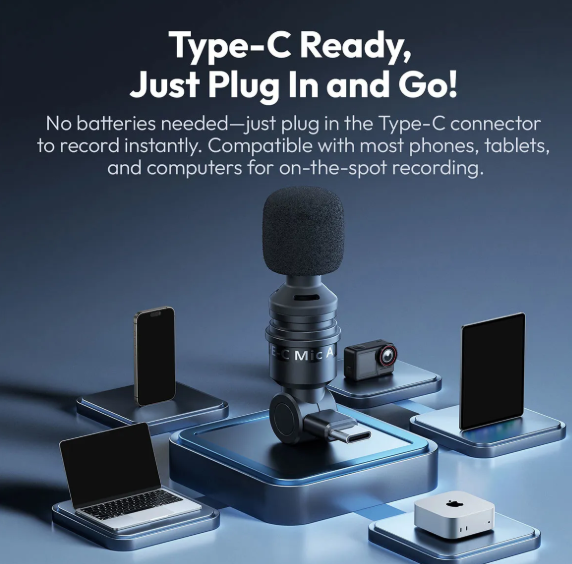 Az AM23 USB Type-C plug-and-play interfésszel rendelkezik, nincs szükség elemre vagy illesztőprogramra – egyszerűen csak csatlakoztassa, és azonnal elkezdheti a felvételt. 180°-ban állítható forgathatósága lehetővé teszi, hogy a mikrofont pontosan úgy helyezze el, ahogyan szüksége van, míg a lengéscsillapító szilikon tartó és a szélálló szivacs minimalizálja a rezgést, a szélzajt és a pukkanó hangokat, így még nehéz körülmények között is stabil felvételeket készíthet.